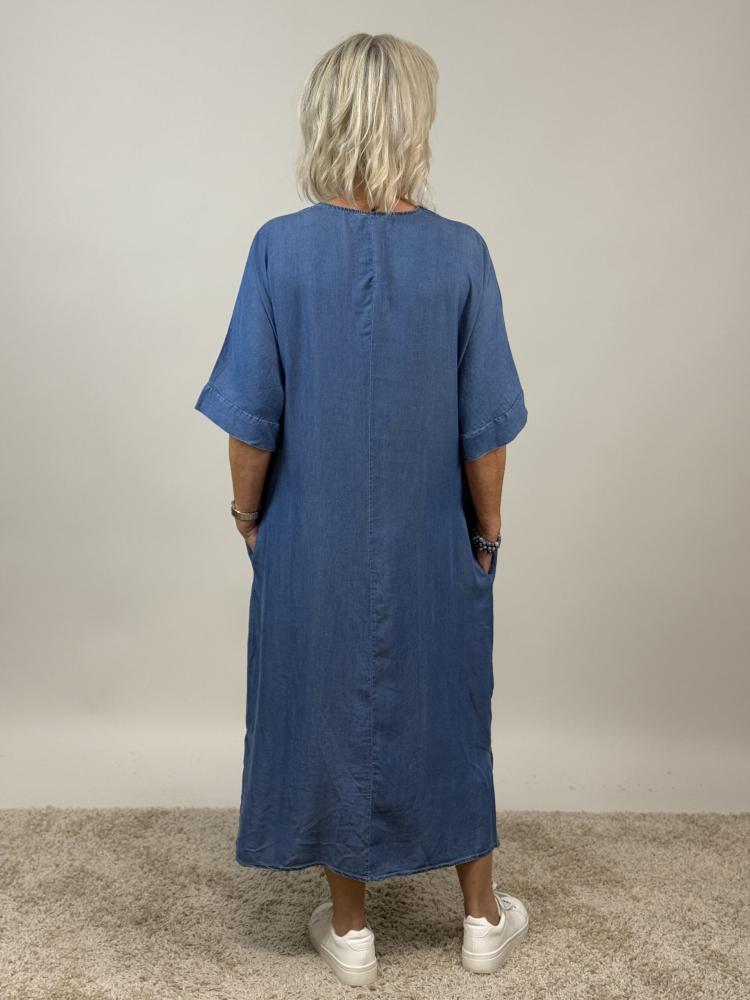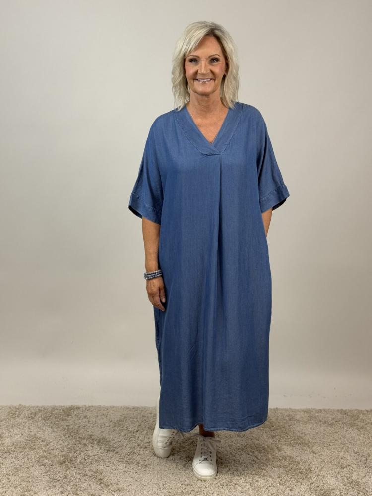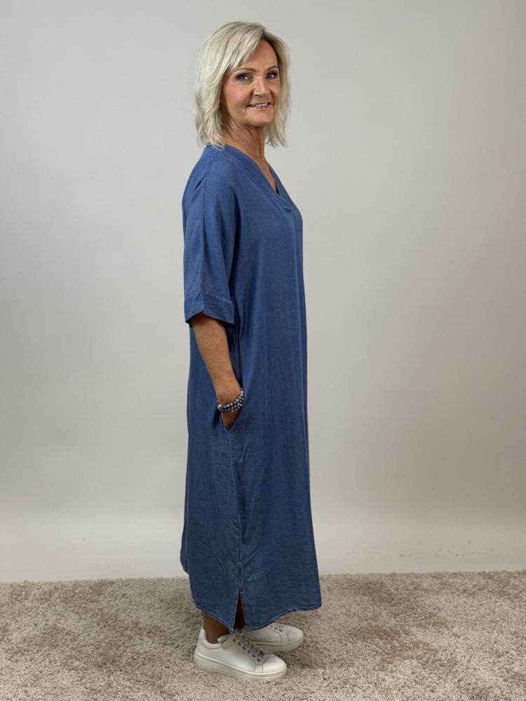 Fantastiskt mjuk och skön "jeansklänning" i tencel (viskose). V-halsad med sytt veck fram, vilket ger bra vidd. Ärm ner till armbågen och fickor i sidan.
