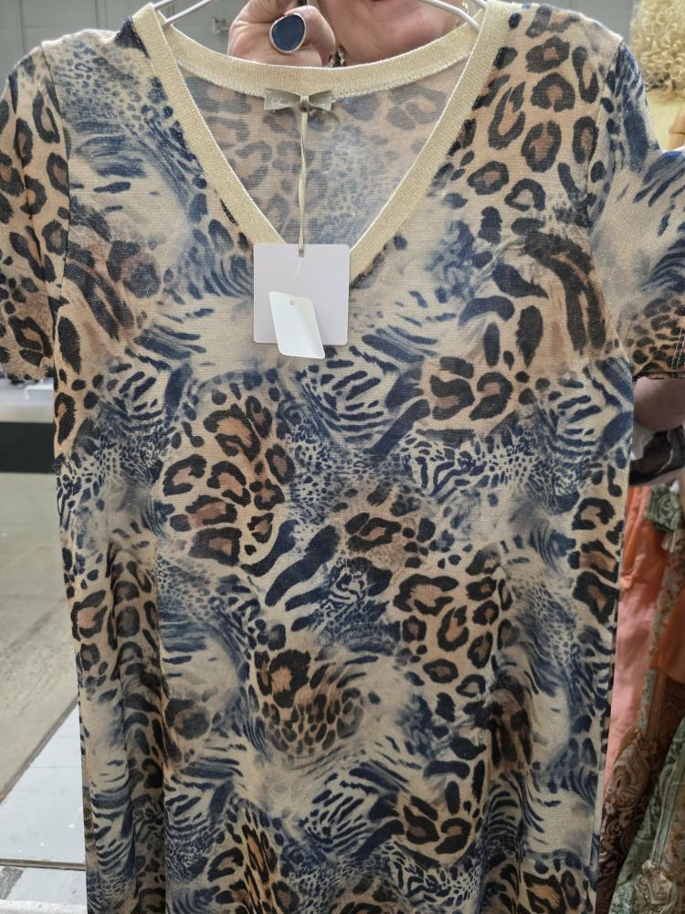 Blå klänning med leo / animalprint. Smått A-format modell med v-hals och kort ärm.