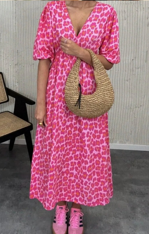 Härlig och sommarfin klänning med cerise leoprint på rosa botten - Stl S/M och L/XL