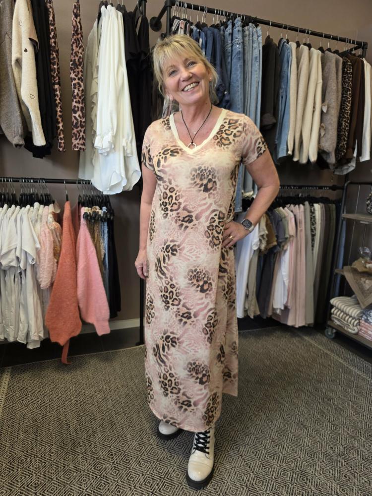 Rosa klänning med leo / animalprint. Smått A-format modell med v-hals och kort ärm.