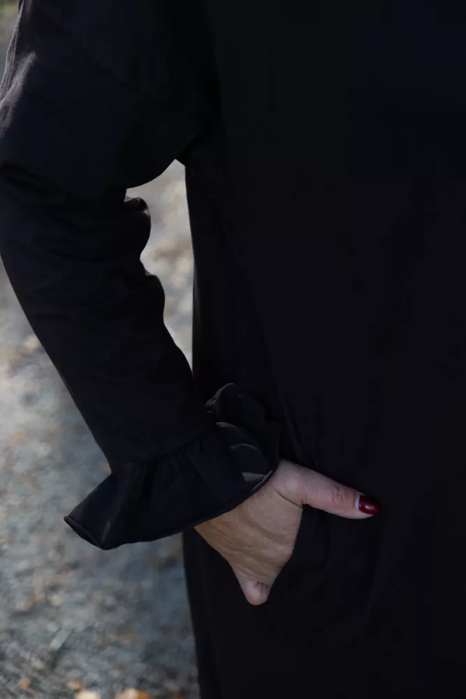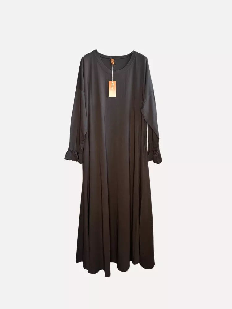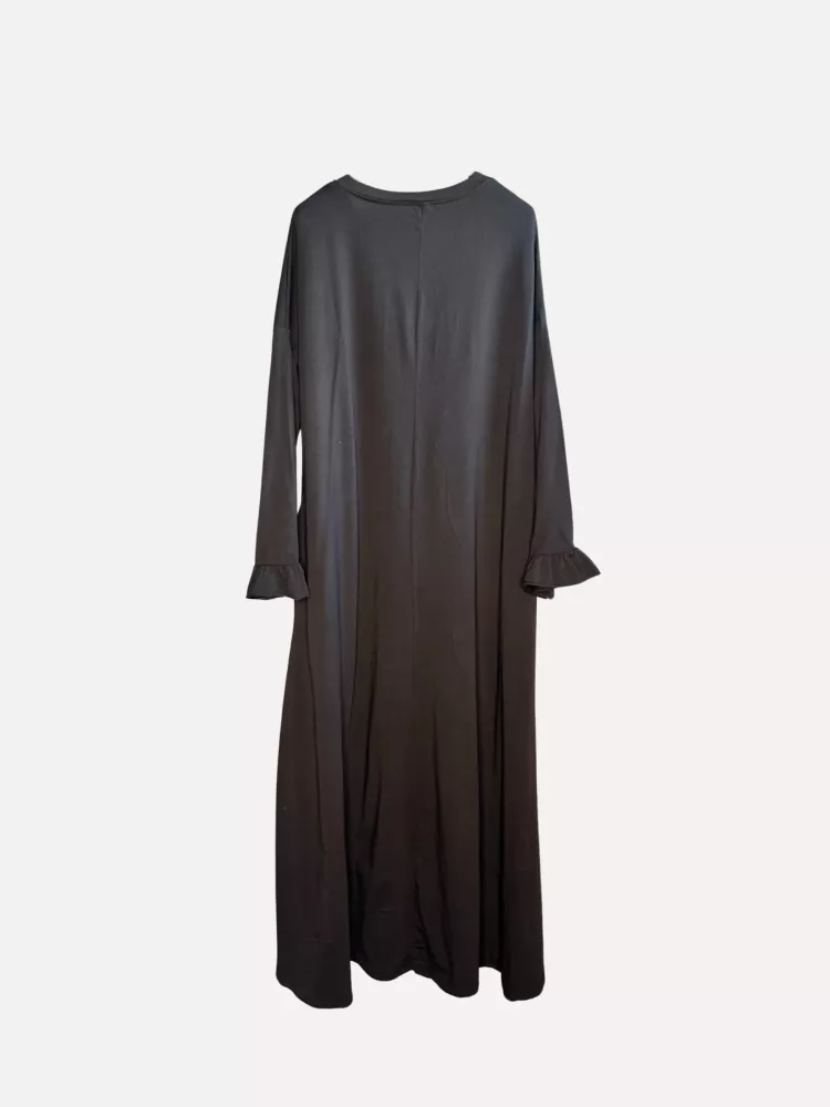 Mörkt brun klänning i bomull, med rund hals och lång ärm som avslutas med en volang. Samt fickor, såklart!!