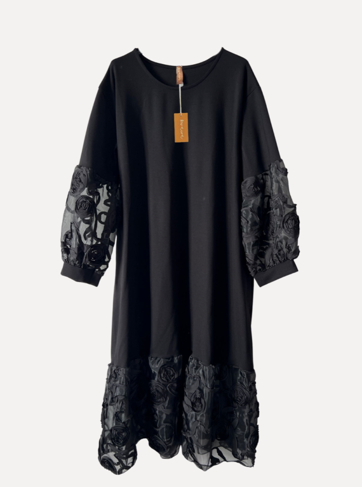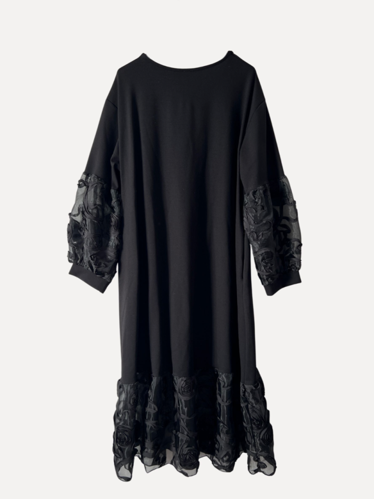Svart klänning i en mix av viskose och polyester, med rund hals och lång ärm som avslutas med en tyll och spetsdetalj