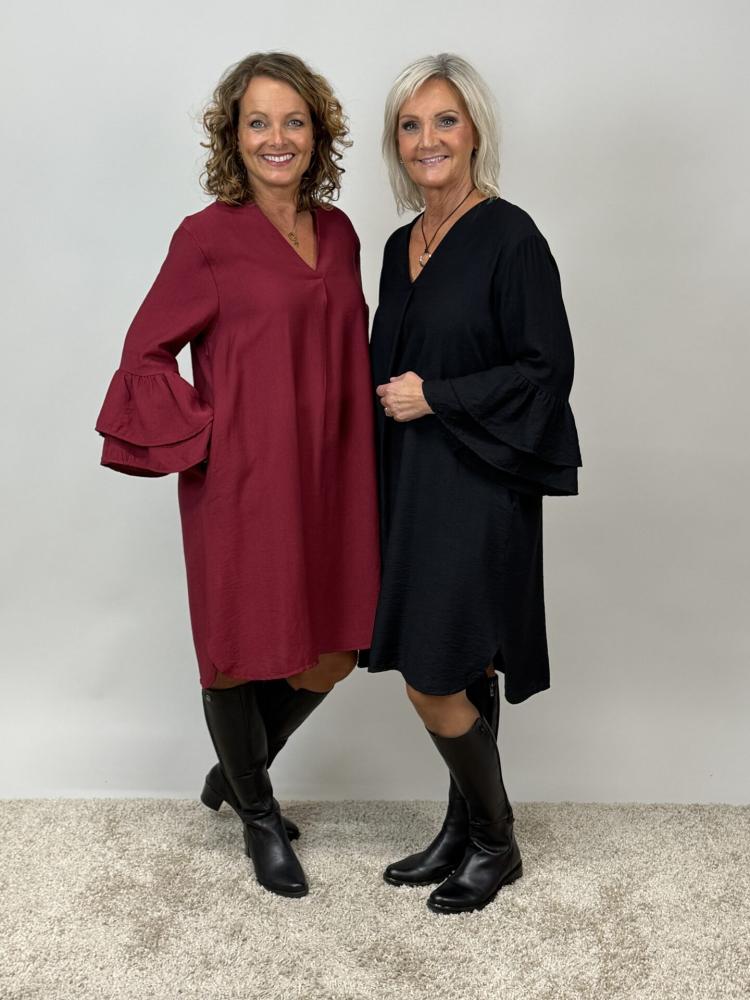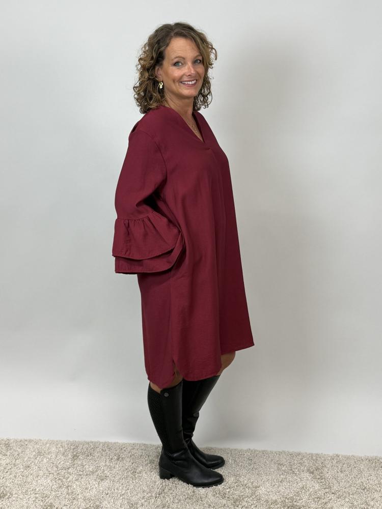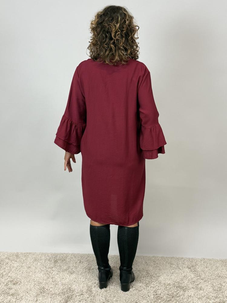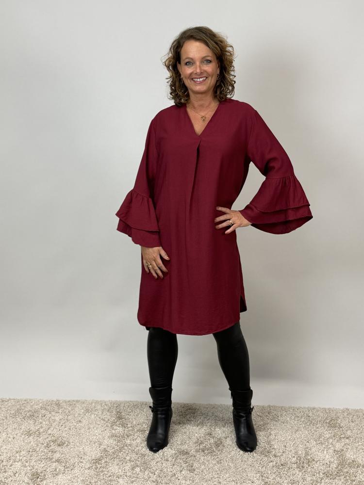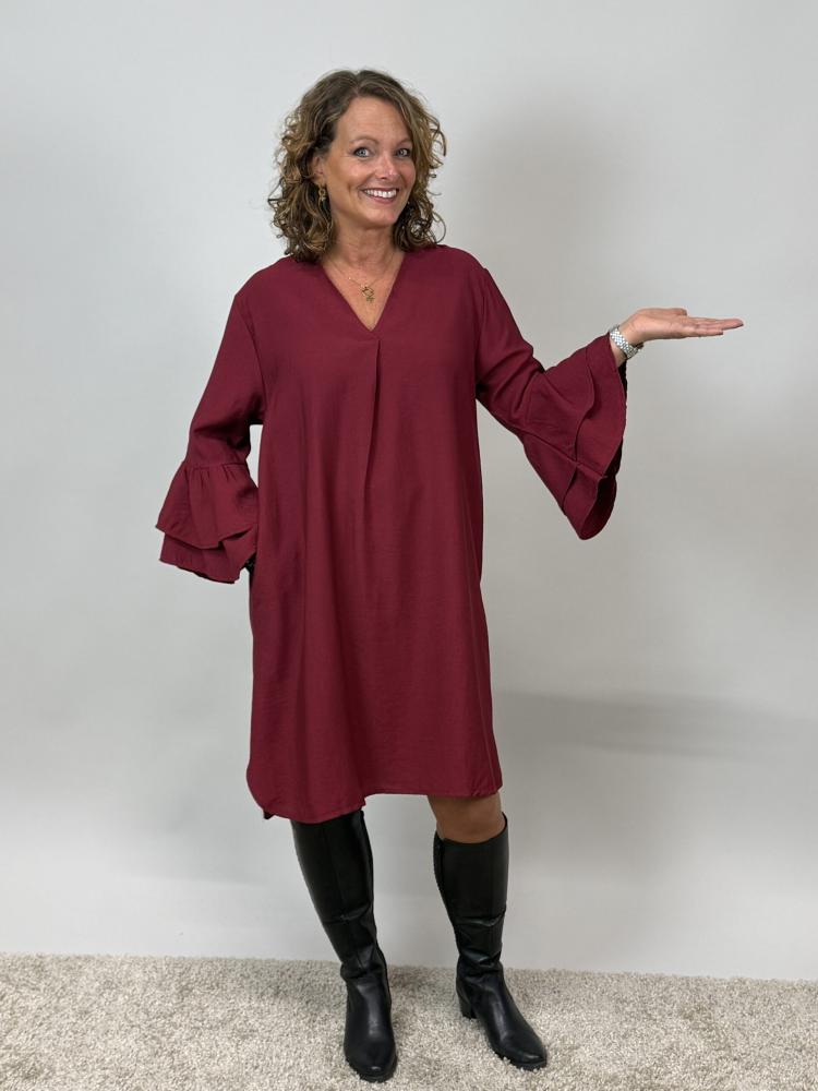 Snygg vinröd klänning med v-hals och sytt veck som ger ett snyggt fall över bysten. Trumpetärm med volanger i ärmslut.