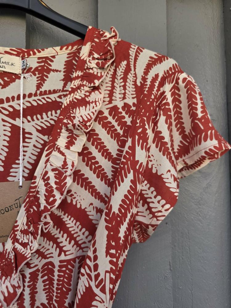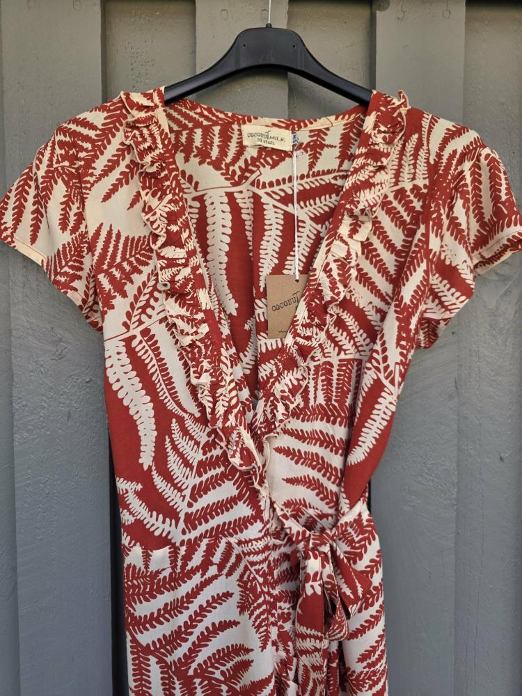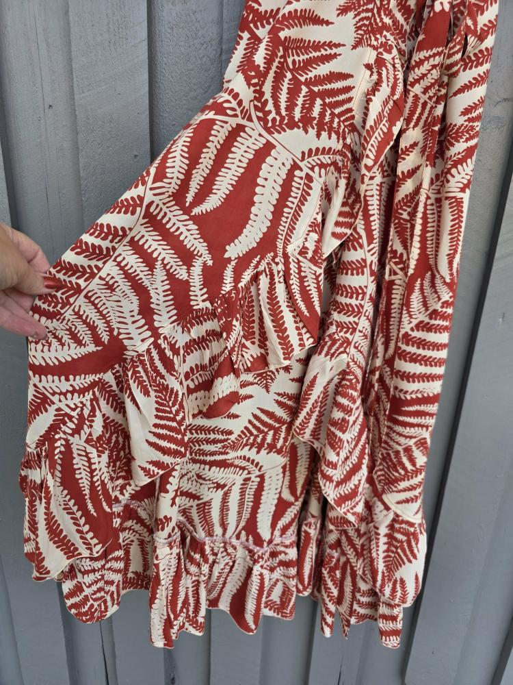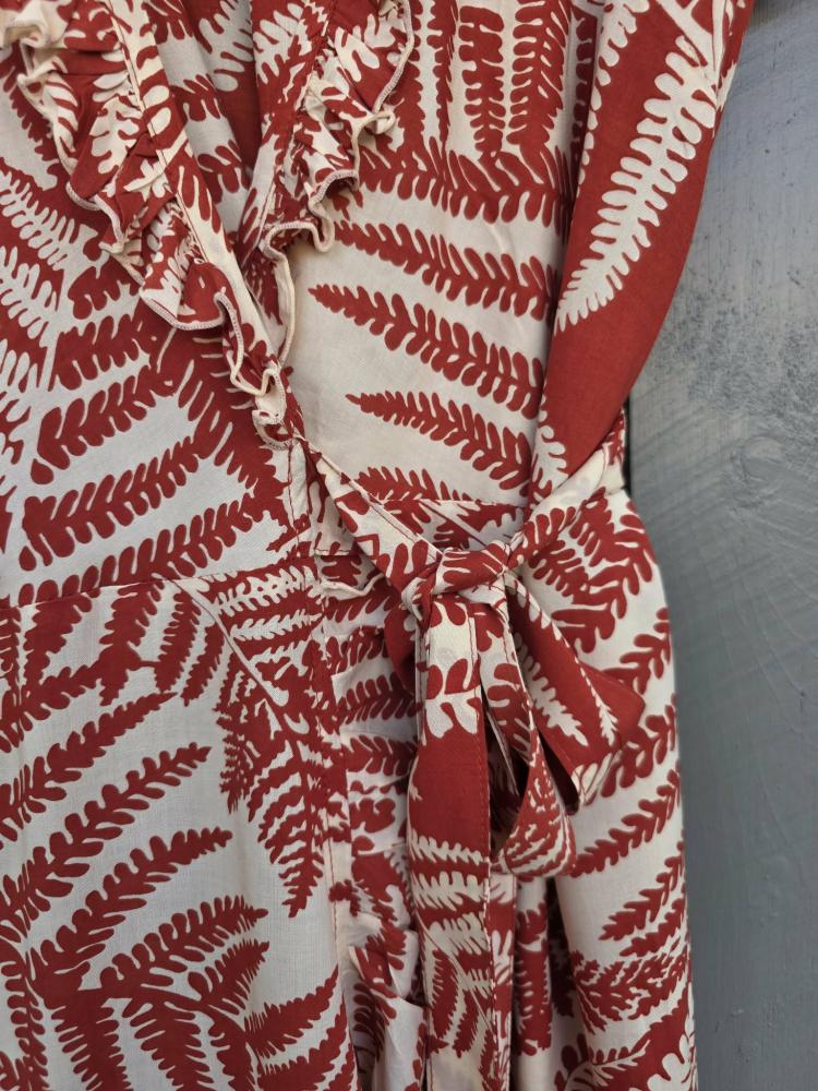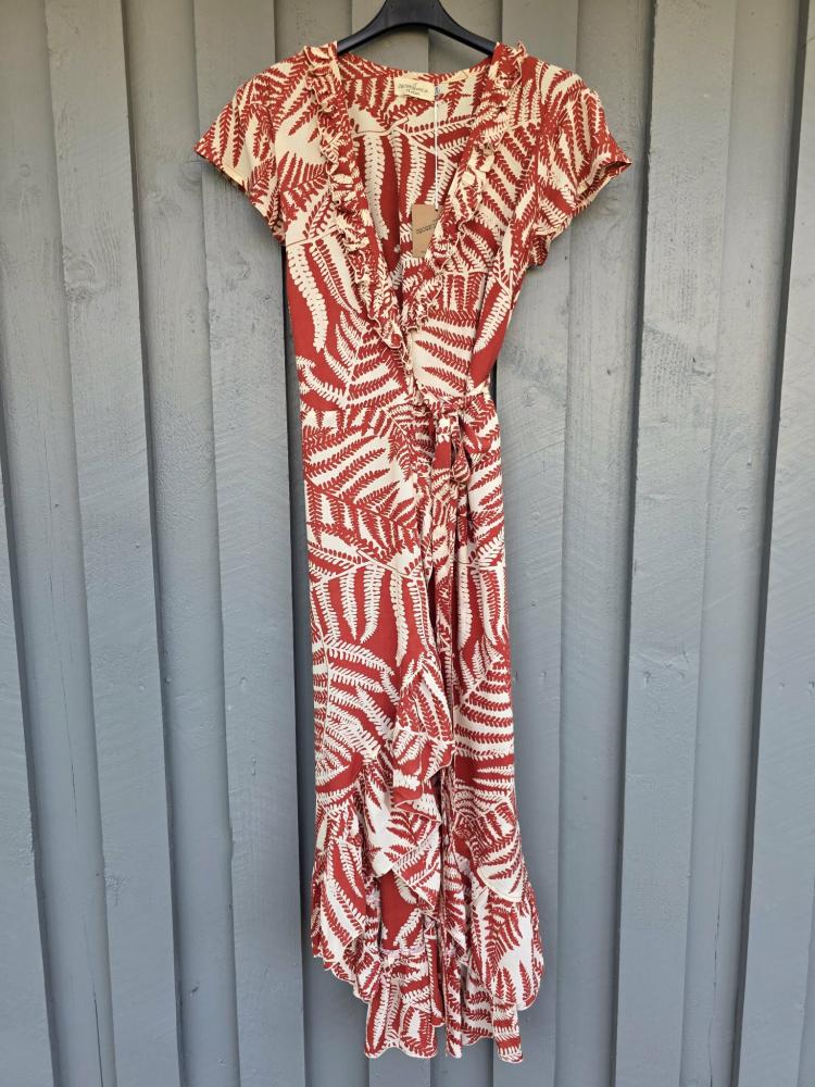 En vacker lång klänning i en sval och skön ryon-kvalitét. Kort holkärm samt volang längs hela urringningen som följer hela vägen ner - och runt. Omlottmodell med knytband. Härligt mönstrad av blad i creme och terracotta.