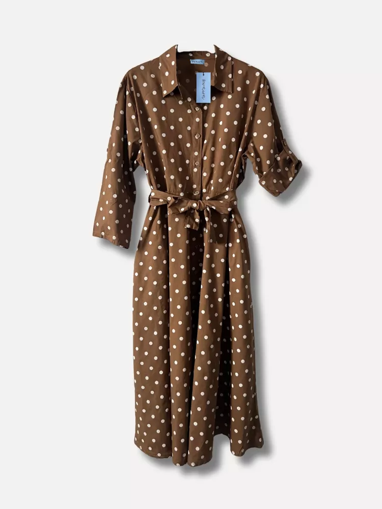 Fräscht med vita prickar på brun klänning, i bästa Audrey Hepburn-anda. Sval, cool bomullspoplin. Klänning med krage, helknäppt samt avtagbart bälte. Lång ärm, som gärna får fästas upp med knappslån.