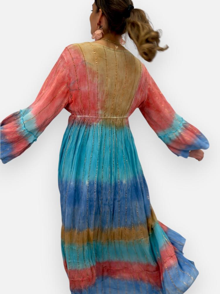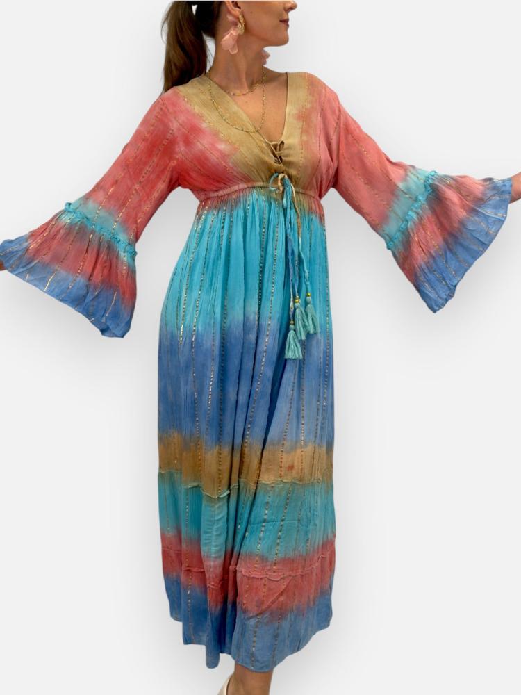 En fantastisk maxiklänning med lite härlig struktur i tyget, trumpetärm och volanger nertill. Diffusa ränder, nästan en känsla av batik; i blått, aqua, korall och sand - med inslag av guld. Resår i midjan, knytband med tofsar fram. Och fickor!!
