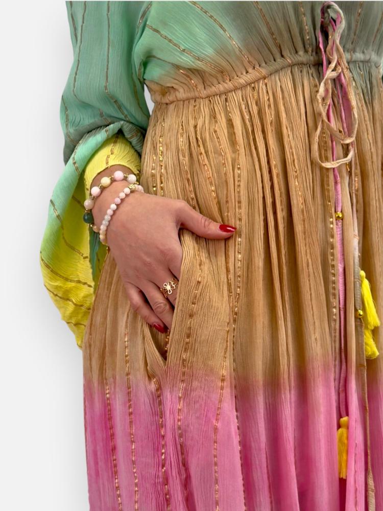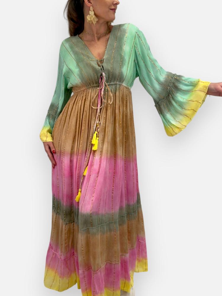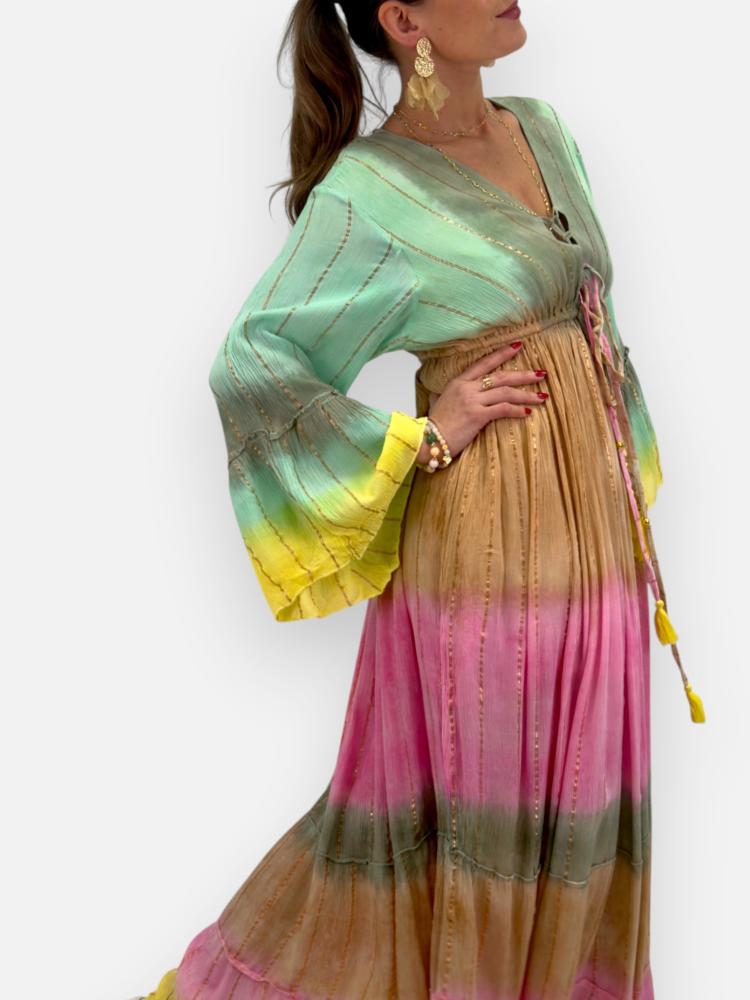 En fantastisk maxiklänning med lite härlig struktur i tyget, trumpetärm och volanger nertill. Diffusa ränder, nästan en känsla av batik; i grönt, bruna toner, rosa och gult - med inslag av guld. Resår i midjan, knytband med tofsar fram. Och fickor!!