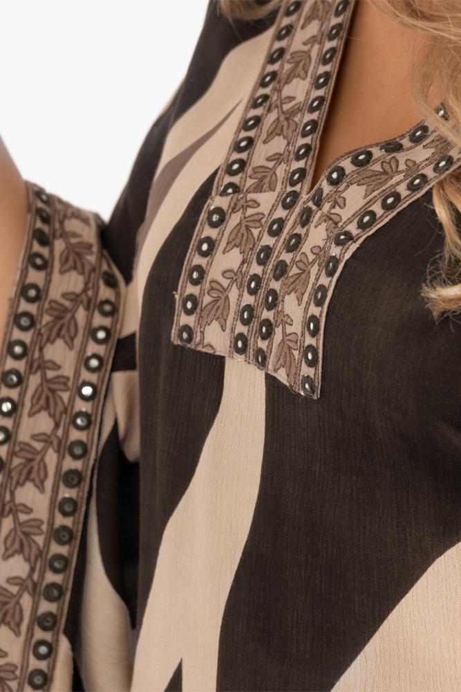 Den vida kjoldelen med sidoslitsar ger rörelse och lätthet, medan de vida trumpetärmarna pryds av brodyr och spegeldetaljer som även återkommer längs den v-ringade halsöppningen.