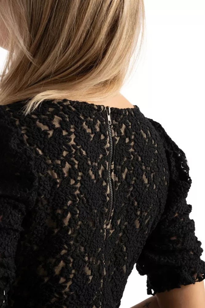 Den knälånga längden är både praktisk och stilig, och den synliga metalldragkedjan i nacken ger en touch av modern elegans. Det är dock kombinationen av det trikå fodret i Golden Sand och den svarta spetsen som verkligen gör klänningen speciell, skapar en bedövande kontrast och lyfter fram spetsens detaljer. Avslutningsvis, den ofodrade puffärmen med sitt elastiska avslut ger en lekfull twist till denna annars sofistikerade skapelse.