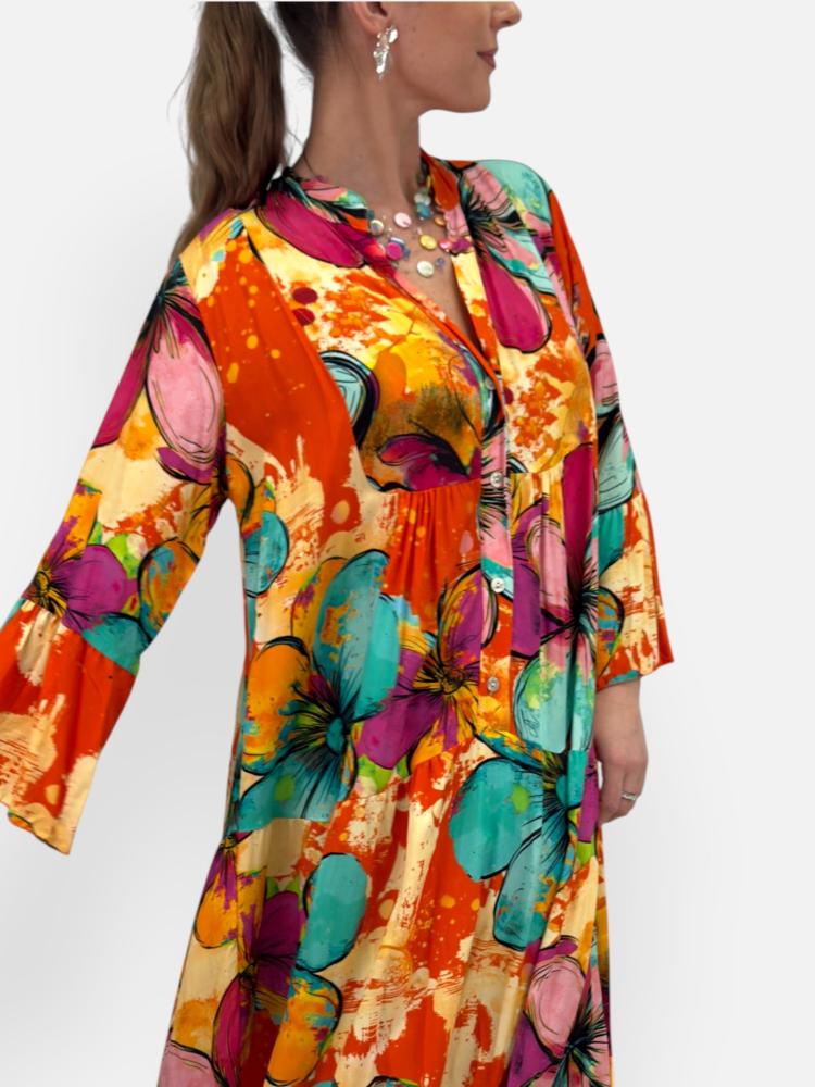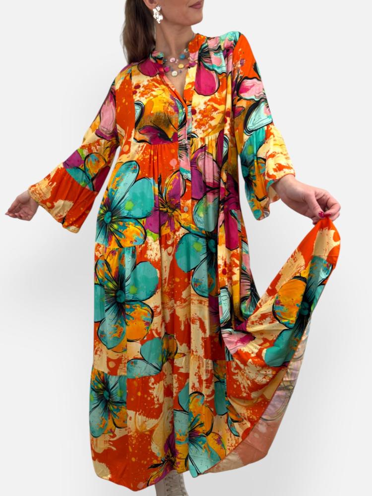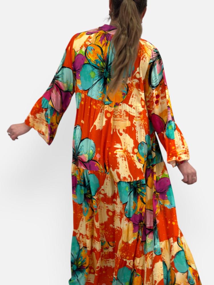 En blommig otrolig maxiklänning i en omtyckt modell, med knappslå fram. Fantastiskt blommönster i en explosion av färger, ser nästan ut som den vackraste akvarelltavla! Trumpetärm och en härlig vidd i kjoldelen.