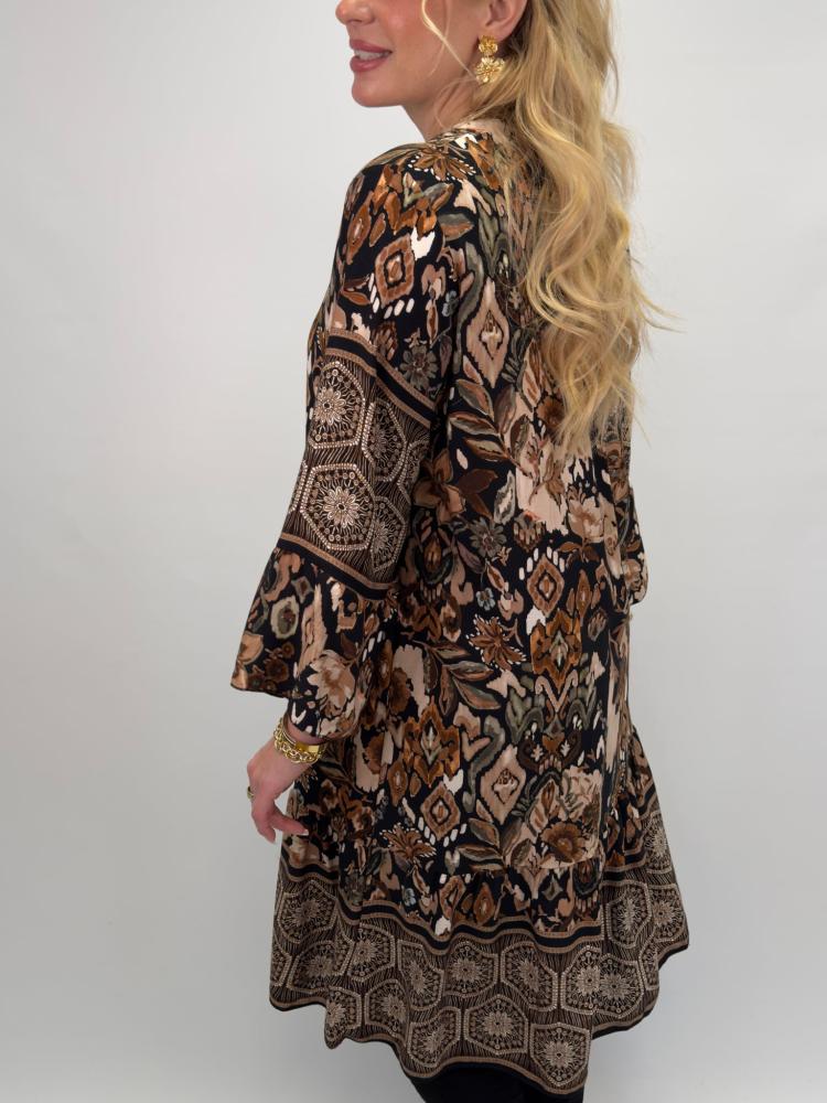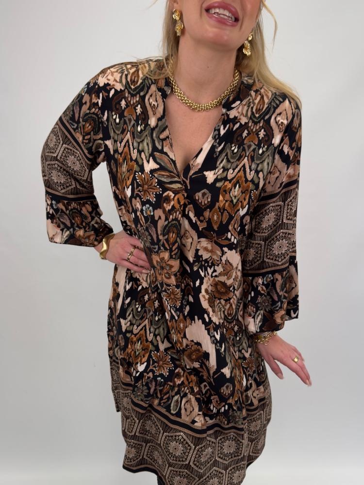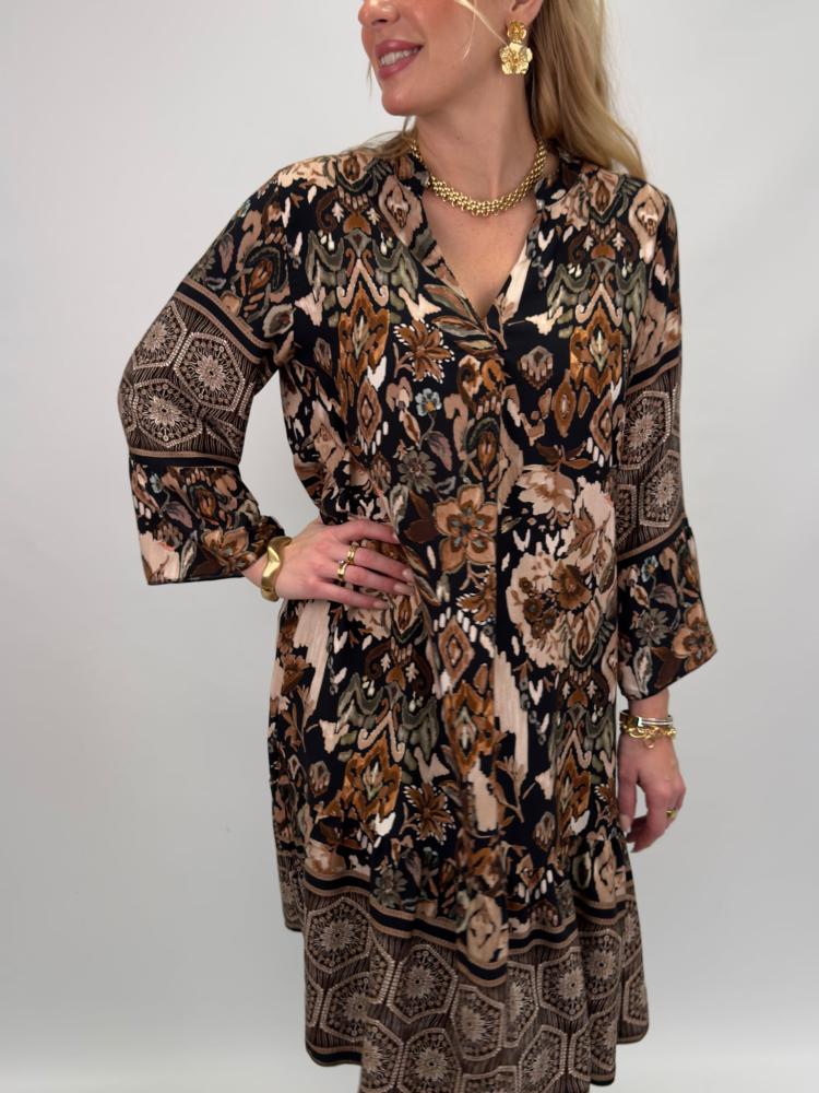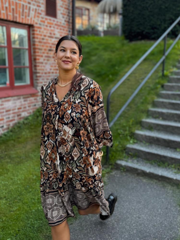 Viskoseklänning med v-hals och volang längst ner på ärm samt längst ner. 3/4 ärm. Blommönster blandat med grafiskt mönster i svart, brunt, sant, kamel mm