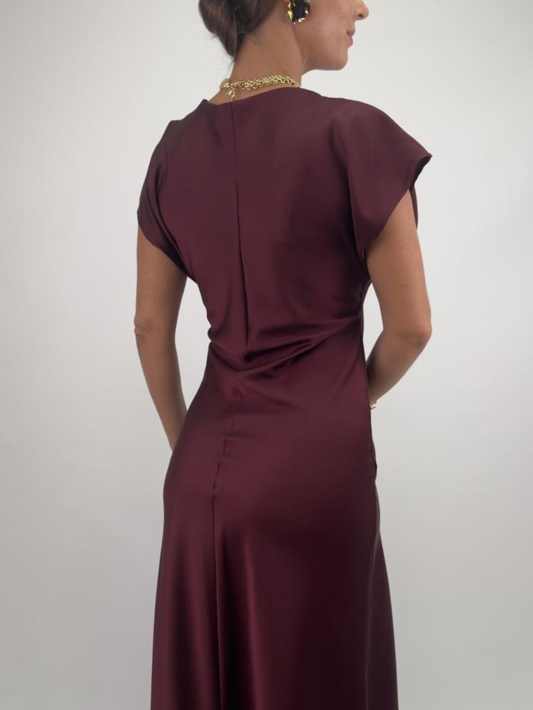 Vacker klänning med elegant draperin i midjan, och ett mjukt material i satinlook vilket ger en smickrande siluett.
