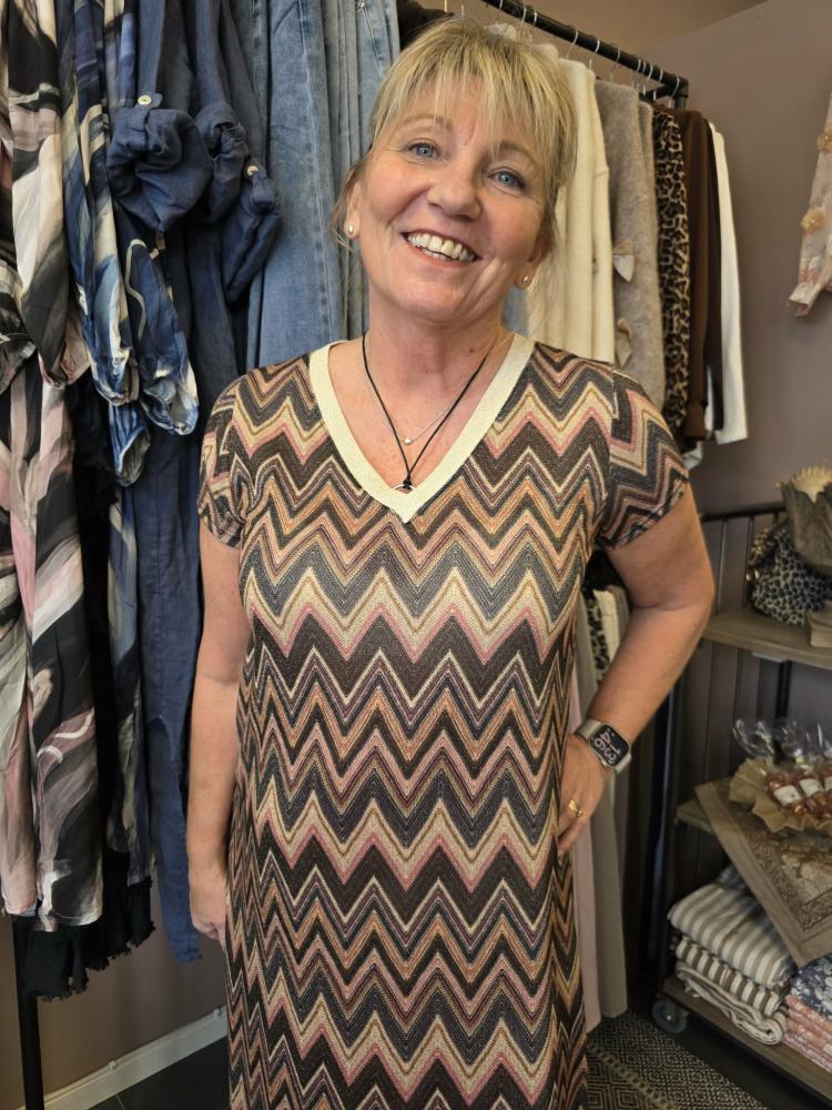 Mönstrad klänning i zick zack. Smått A-format modell med v-hals och kort ärm. Lycra i trådarna ger lite härlig lyster.