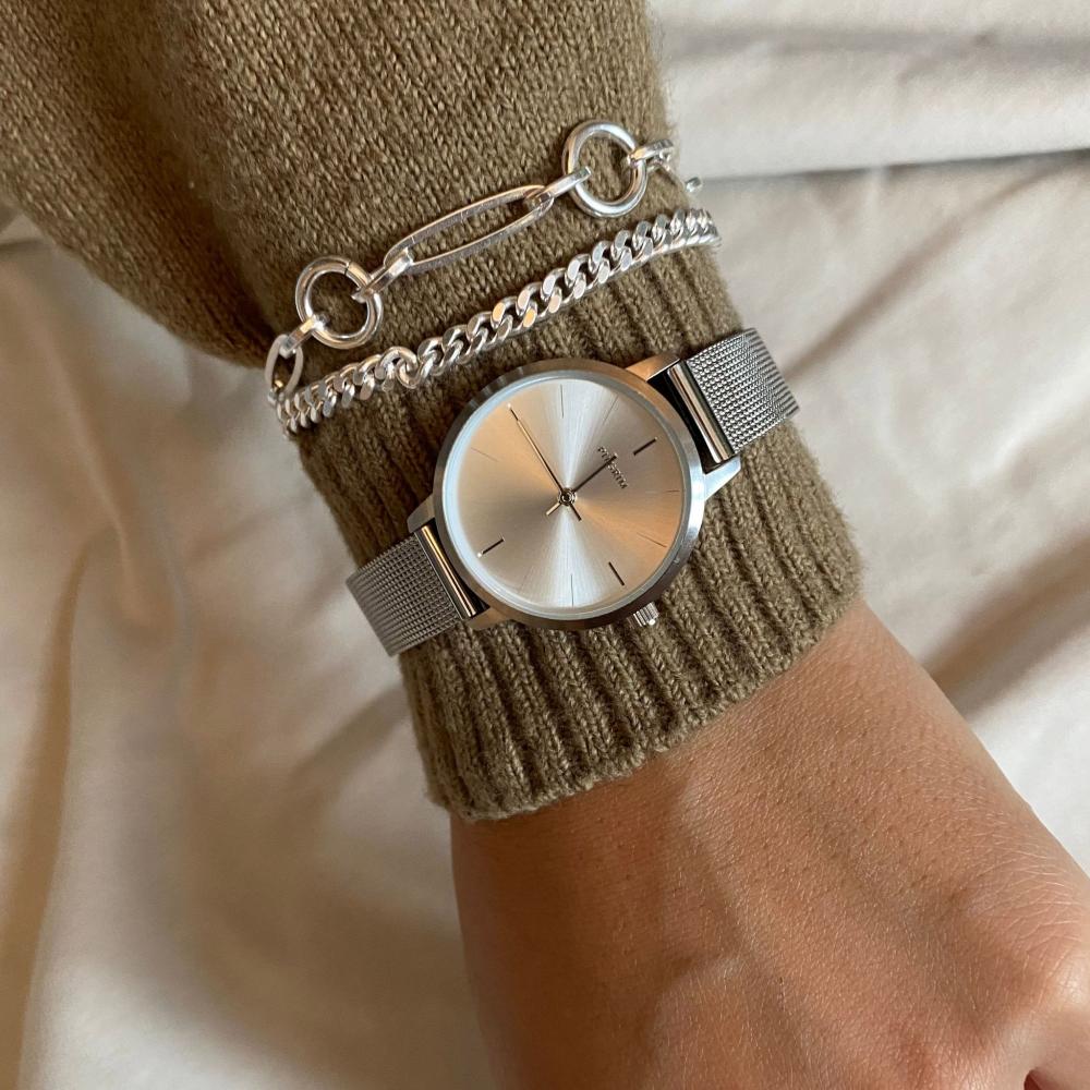 Vackert silverpläterat armbandsur i rostfritt stål. Den eleganta boetten är silverpläterad och matchas av det silverpläterade armbandet, indexstrecken och visarna. Armbandets fina struktur och boettens klassiska runda form kompletteras av den stora urtavlans borstade, silverpläterade finish och de diskreta indexstrecken. Tillsammans skapar de en elegant skandinavisk design för den kvalitetsmedvetna kvinnan. Alla klockor är tillverkade med de bästa japanska kvartsurverken och utrustade med mineralglas av hög kvalitet. Alla klockor är nickelfria och vattentäta till 3 ATM, vilket innebär att de klarar regn och stänk (inte vattentäta).