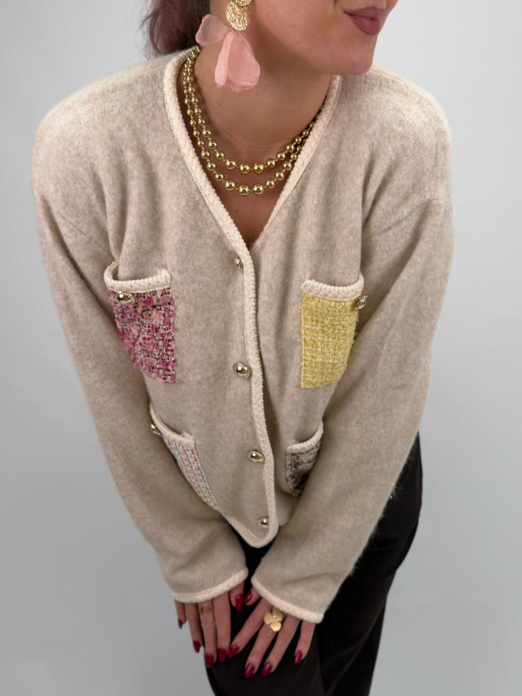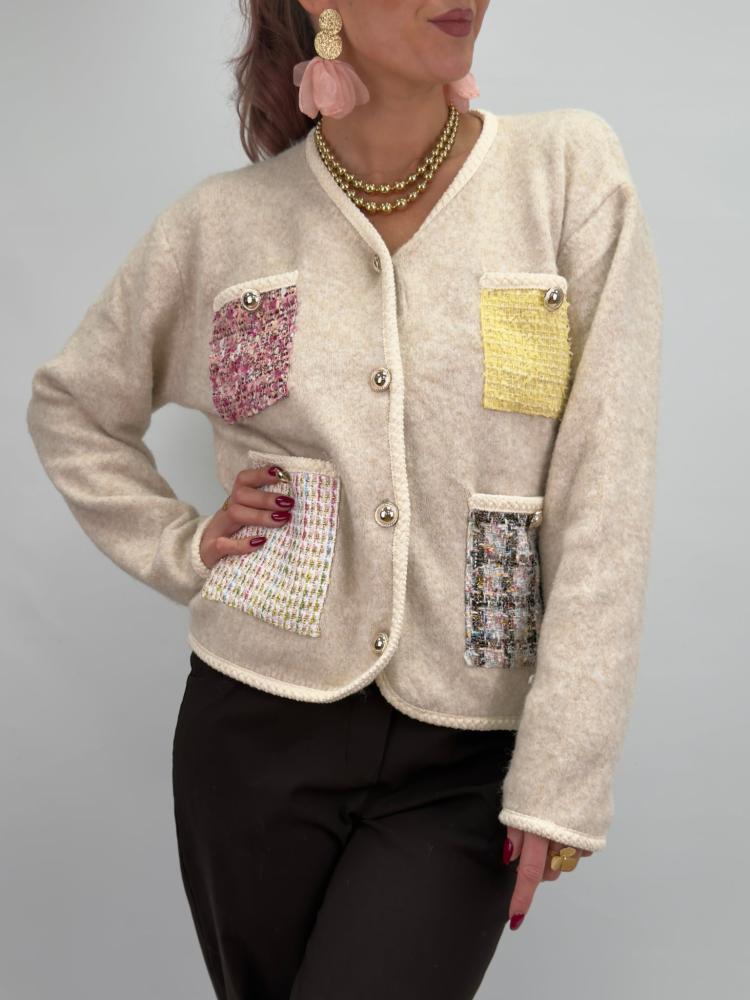 En jacka / kofta full med festliga detaljer, så som de påsydda fickorna i olika tyger - Onesize (stl 34-44)