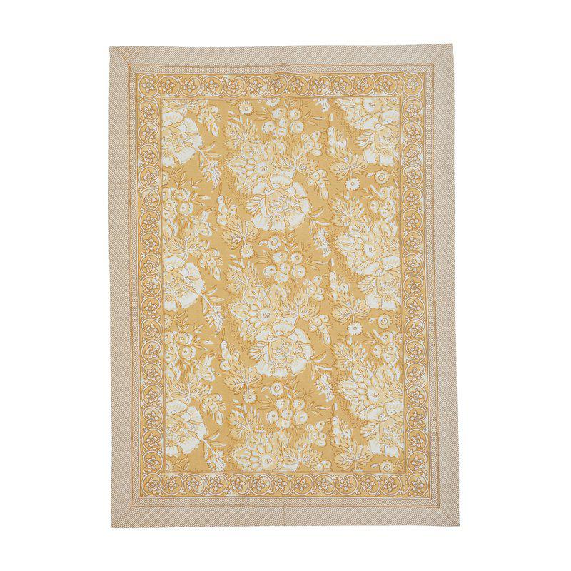 Vacker gul kökshandduk att pryda köket med, trevligt blommönster samt randig kant runtom.