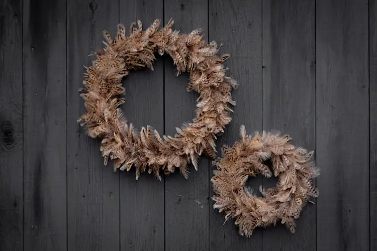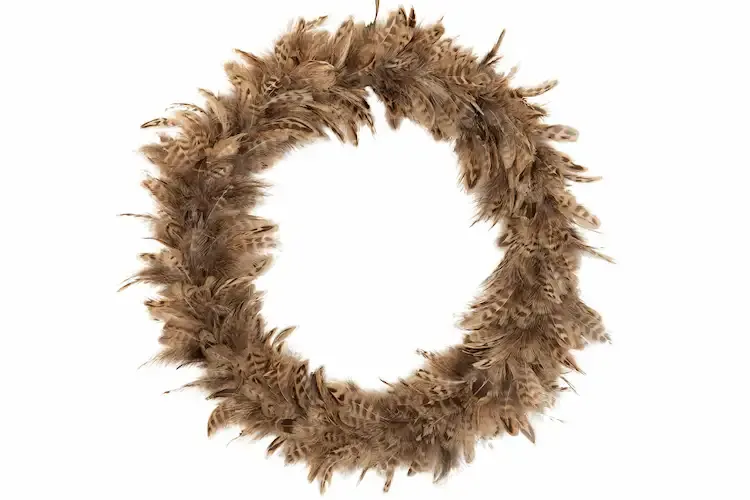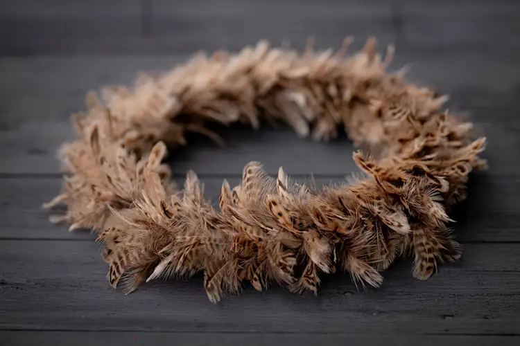En dekorativ krans med fjädrar i bruna toner