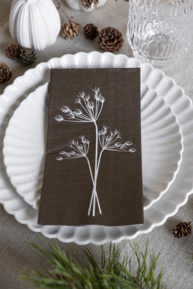 Dekorativ servett i en härlig brun nyans med siluetterna av 3 fröställningar i vitt.