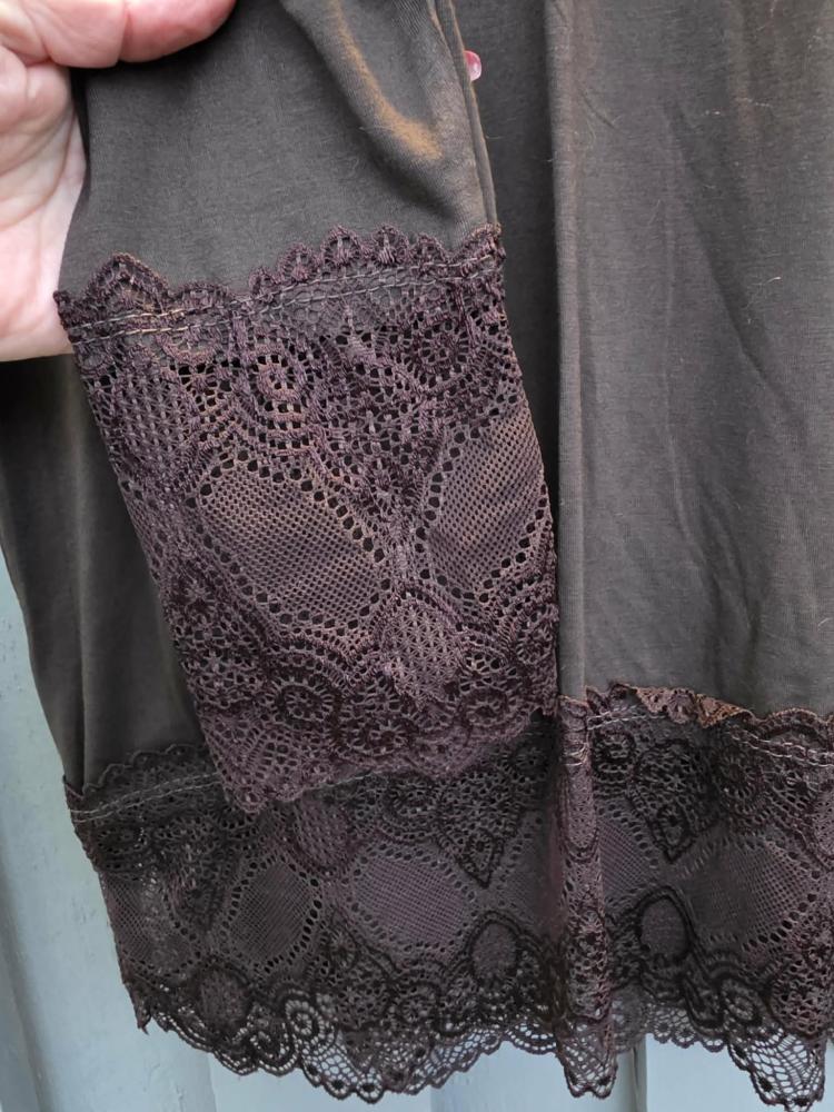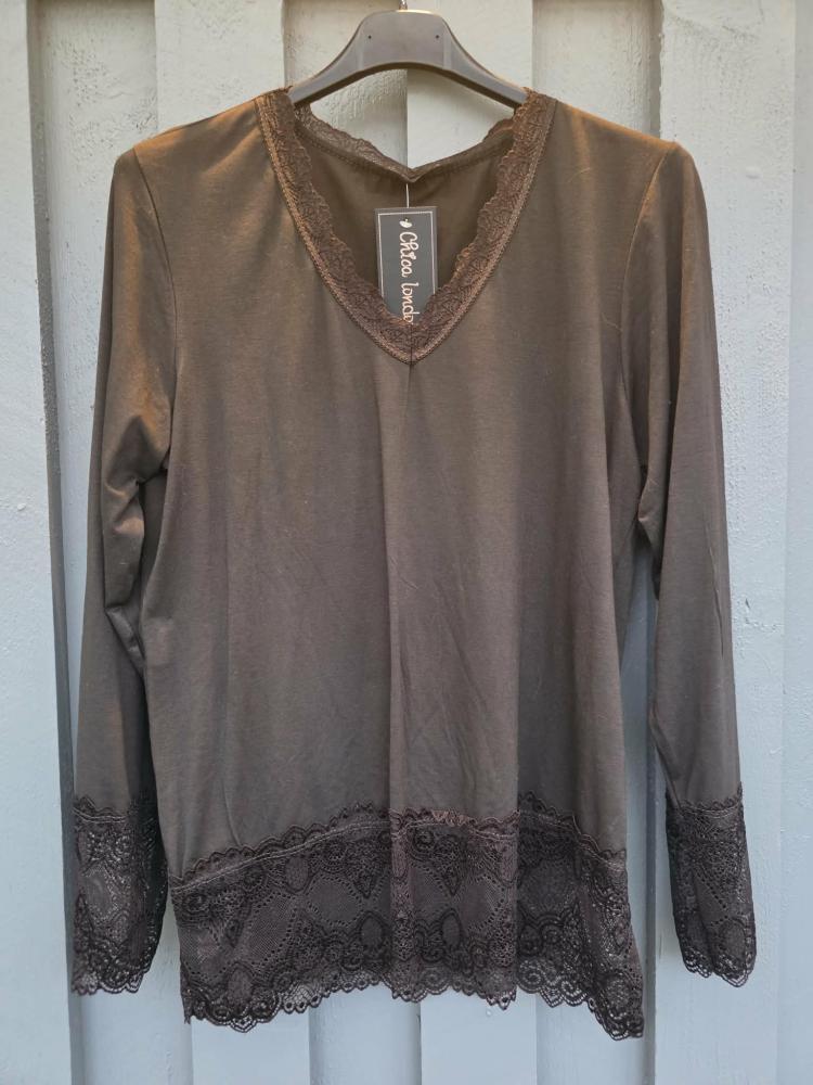 Brun v-ringad topp i ett mjukt och skönt material. Vacker spets i halsringning, ärmslut samt nertill.