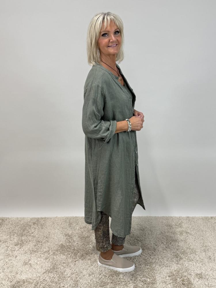 Army grön linneklänning / lång skjorta - bekväm och enkel modell utan krage och med knappar hela vägen fram