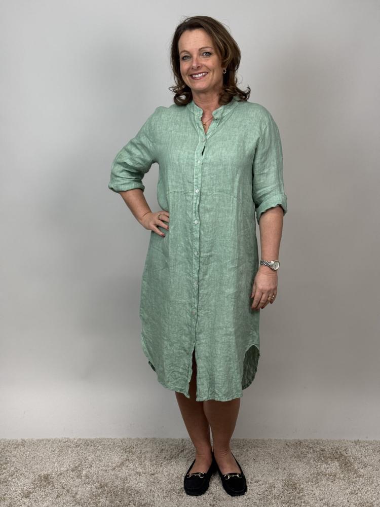 Härligt grön linneklänning / lång skjorta - bekväm och enkel modell utan krage och med knappar hela vägen fram