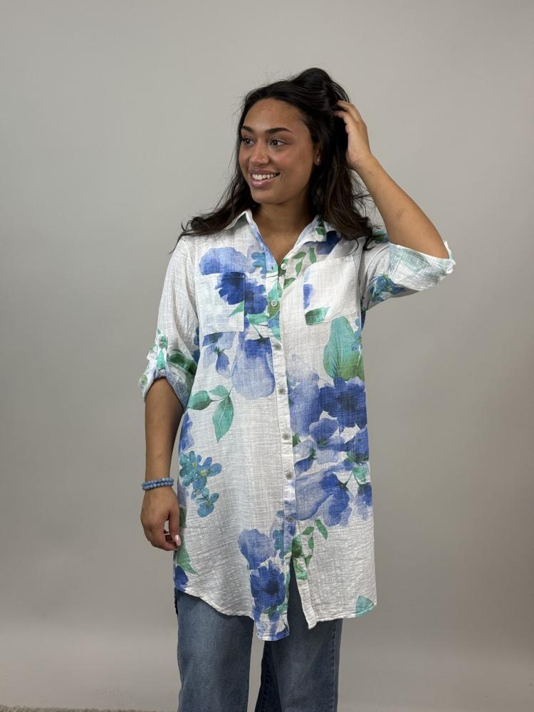 Lång skjorta i grovt vävd bomull, vilket ger en härlig linnekänsla - blommor i klara blå och gröna toner, på vit botten - Onesize