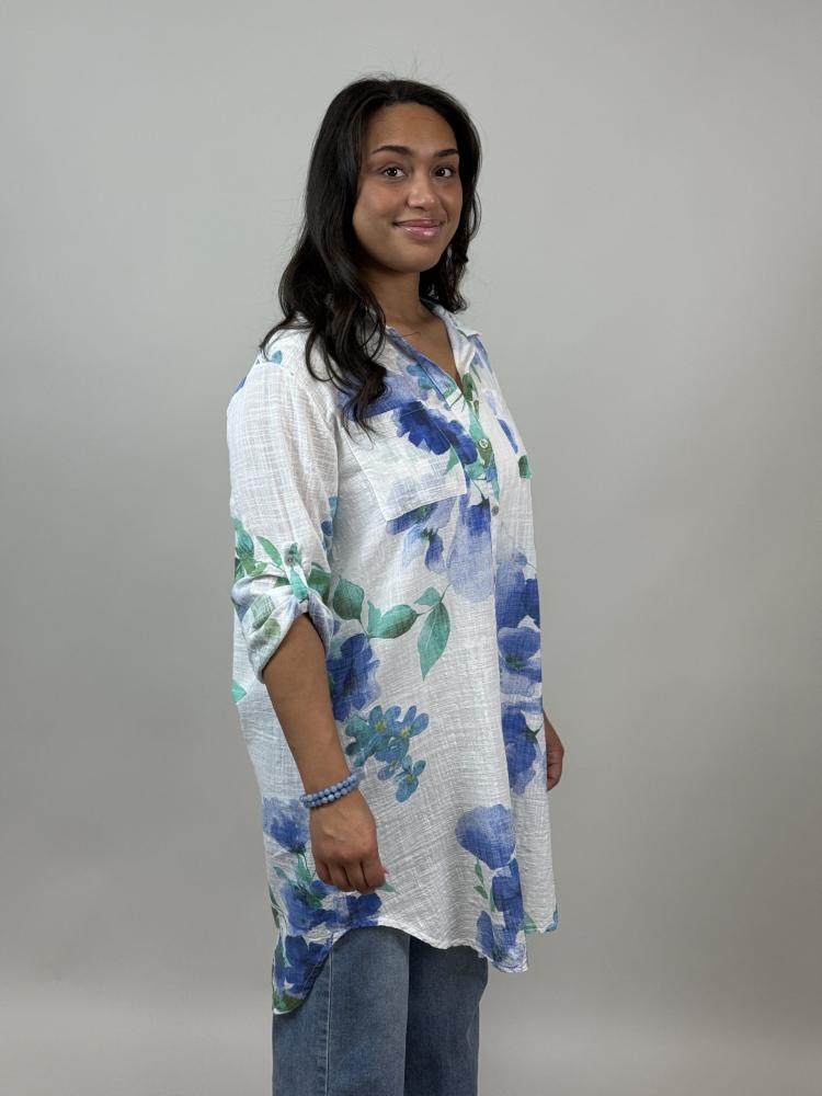 Storblommig vit skjorta med krage och bröstfickor, knappar hela vägen fram. Lång ärm med rakt ärmslut som rullas upp och knäpps på ärm. Lika snygg att bära öppen - som knäppt.