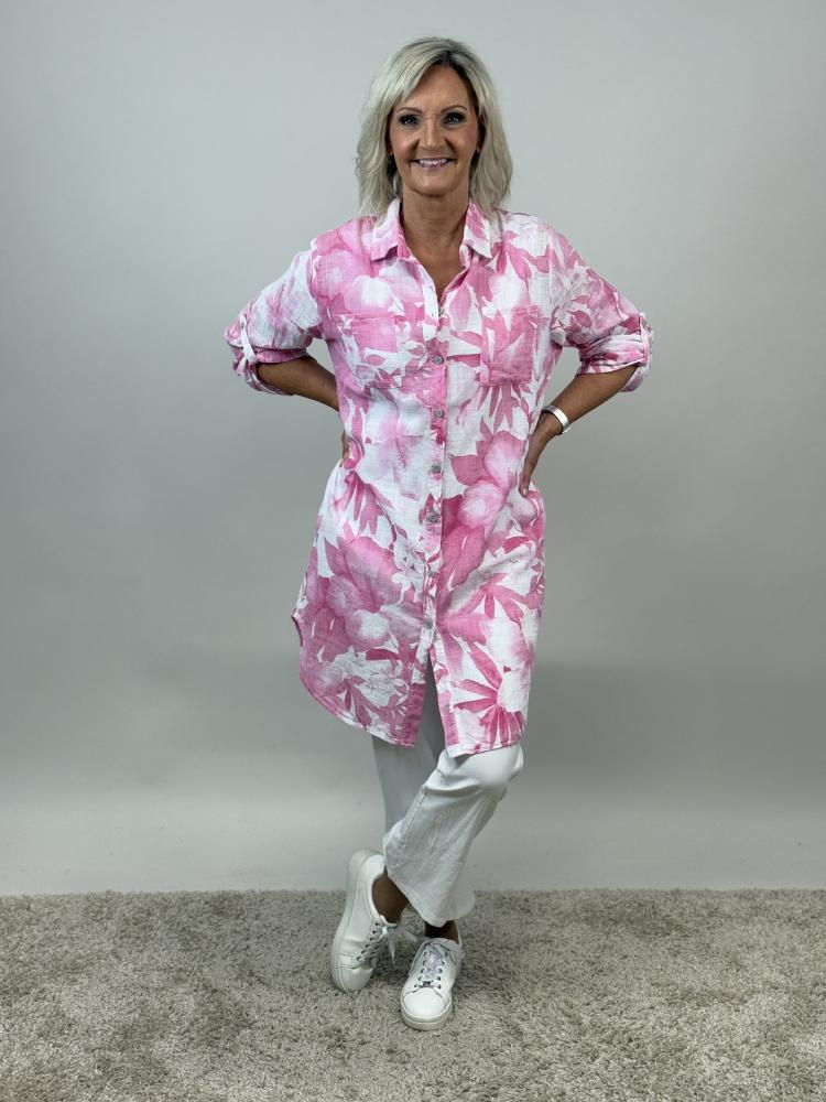 Lång skjorta i grovt vävd bomull, vilket ger en härlig linnekänsla - blommor i starka rosa toner, på vit botten - Onesize