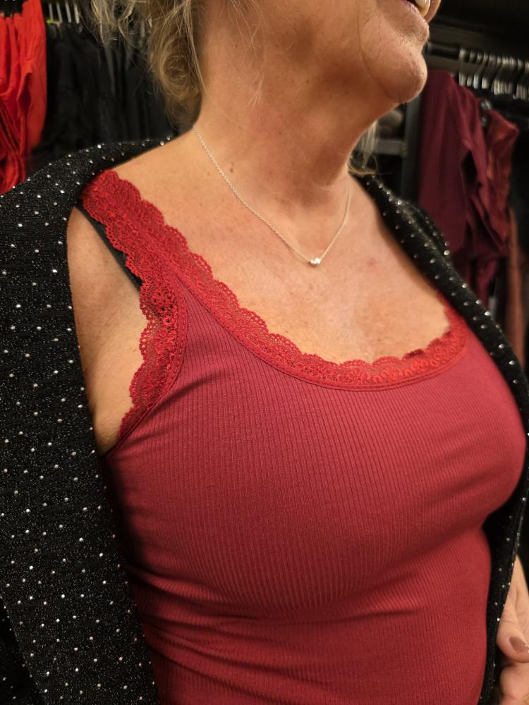 Fint vinrött linne att ha under tröjan, toppen, kavajen... I en mjuk, ribbad kvalitét med fin spetskant kring halsen.