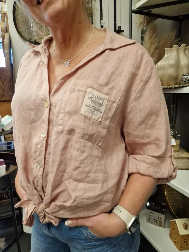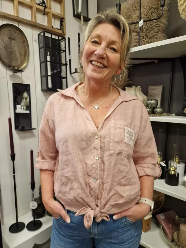 V-ringad linneskjorta i en mjuk och behaglig smuts rosa ton - med liten krage, rak ärm med knappslå på ärmen och knyt framtill.