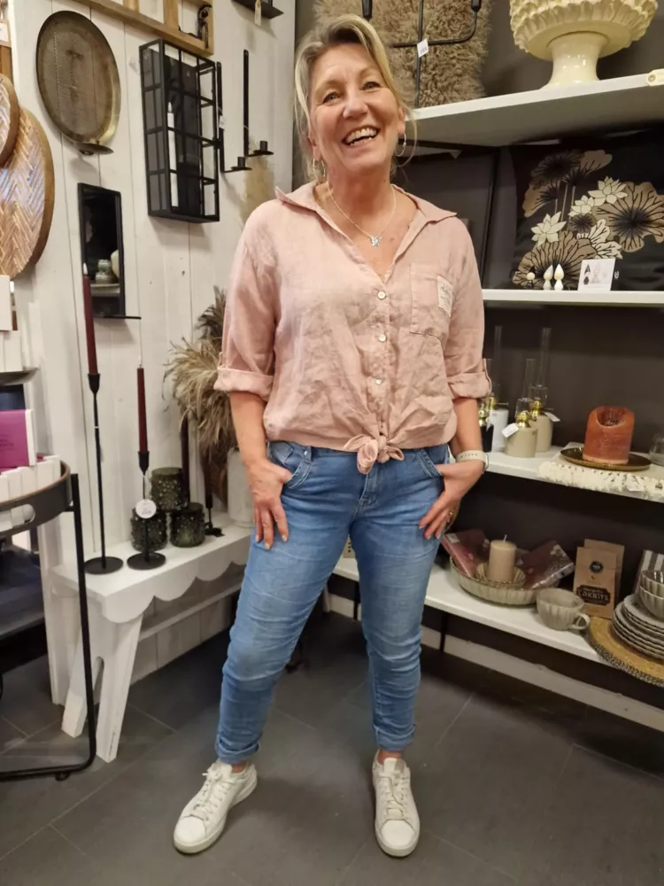 Annie blusen är tillverkad i 100% linne, vilket gör den både slitstark och sval. Linnetyget andas och ger en naturlig, mjuk känsla, perfekt för långa dagar. Materialet är lätt att underhålla och blir bara mjukare efter varje tvätt.