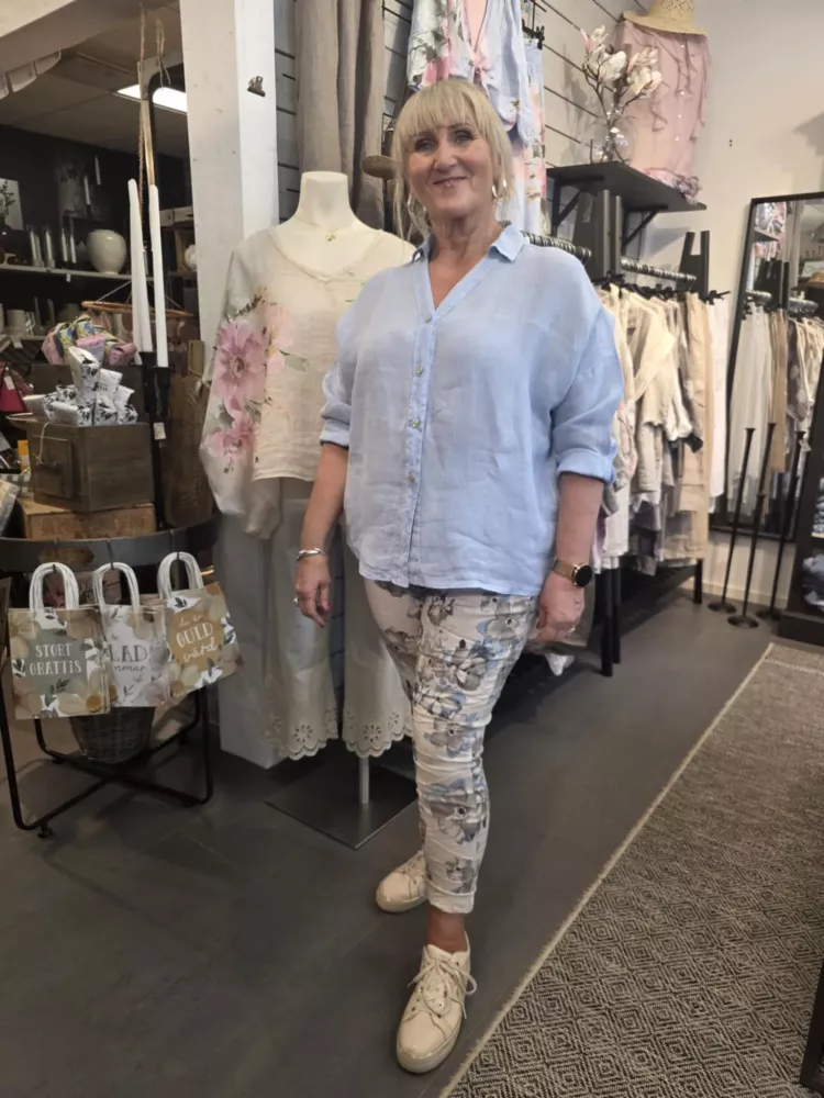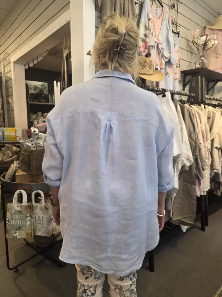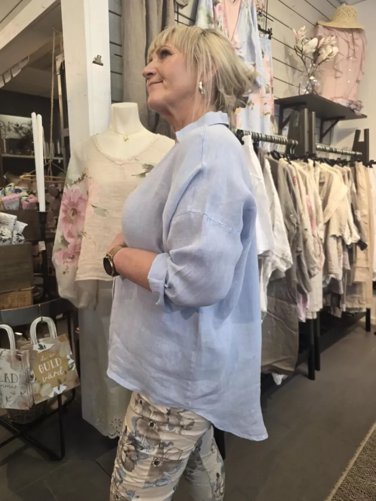 En trevlig ljust blå linneblus, v-ringning med knappar fram. Kortare fram än bak.