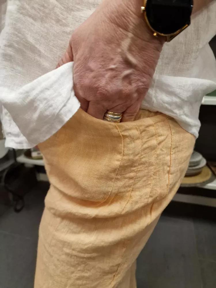 Härliga linnebyxor i en mjuk och fin aprikos nyans. Fickor fram och snygg detalj med sydda veck vid fickan.