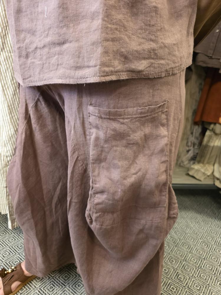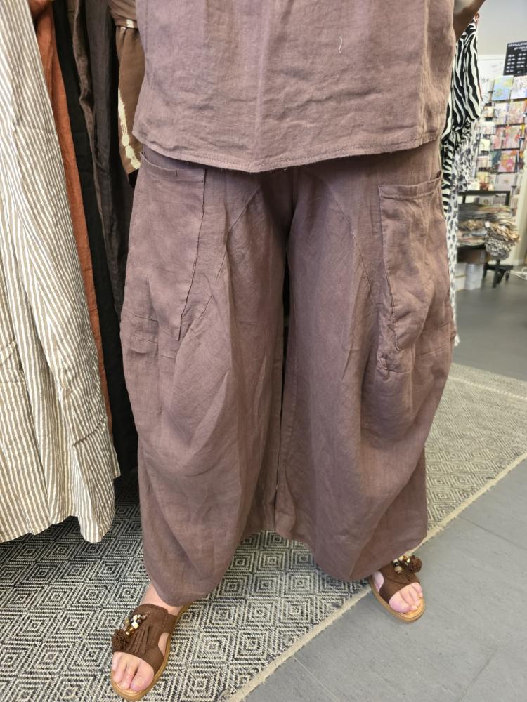 Härligt vid och skön brun byxa i 100% linne. Resår i midjan, två stora fickor fram samt drapering i sidan vilket ger extra vidd och en mysig bohemisk känsla.