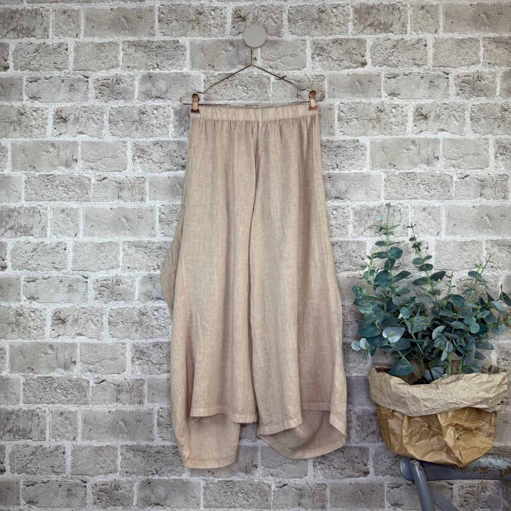 Härligt vid och skön sandfärgad byxa i 100% linne. Resår i midjan, två stora fickor fram samt drapering i sidan vilket ger extra vidd och en mysig bohemisk känsla.