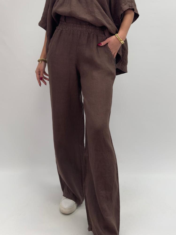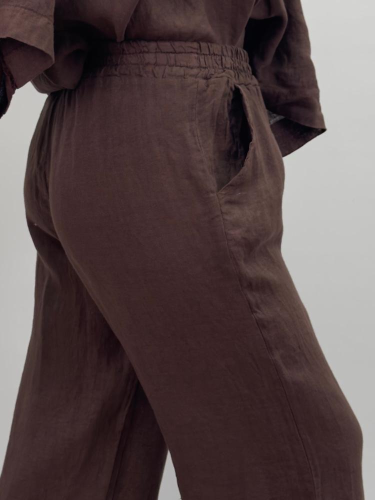 Bekväm och fräsch linnebyxa i trendigt brun. En avslappnad och luftig passform med bred resår i midjan, fickor fram och vidd i benen.