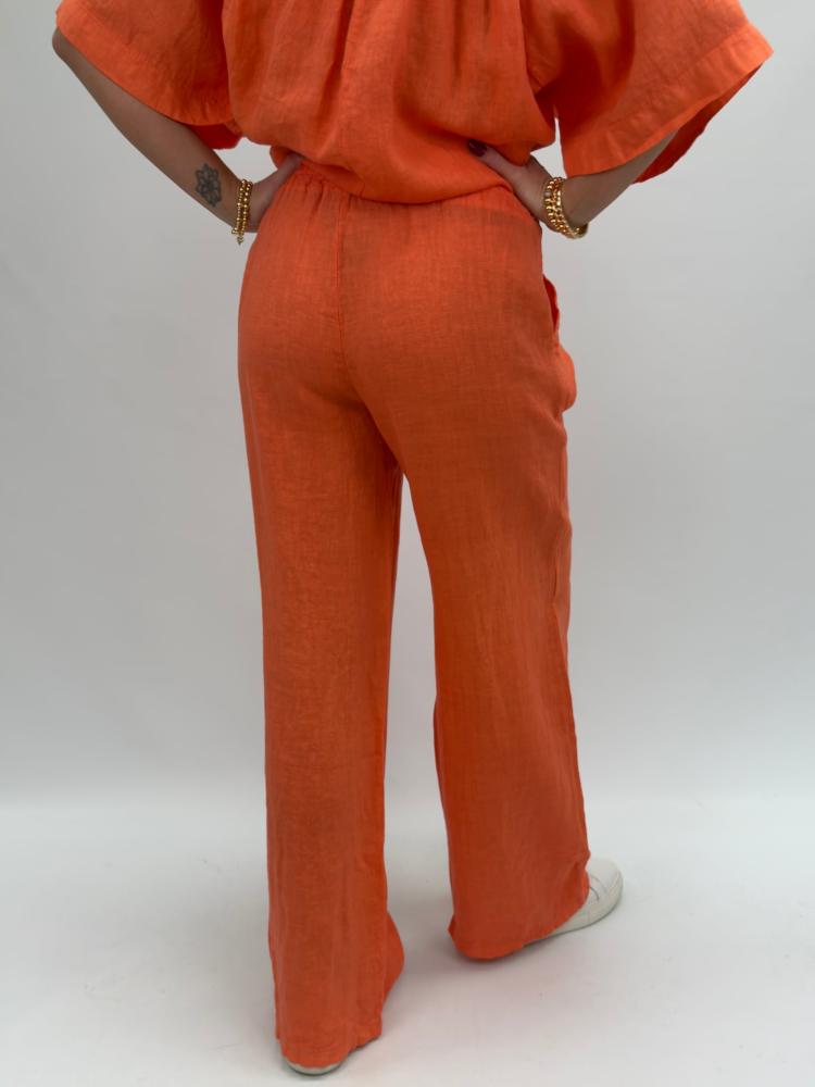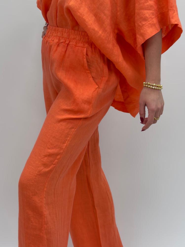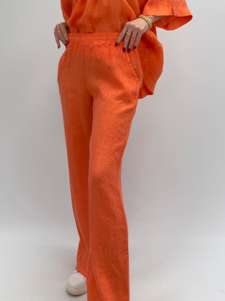 Bekväm och fräsch linnebyxa i trendigt orange. En avslappnad och luftig passform med bred resår i midjan, fickor fram och vidd i benen.