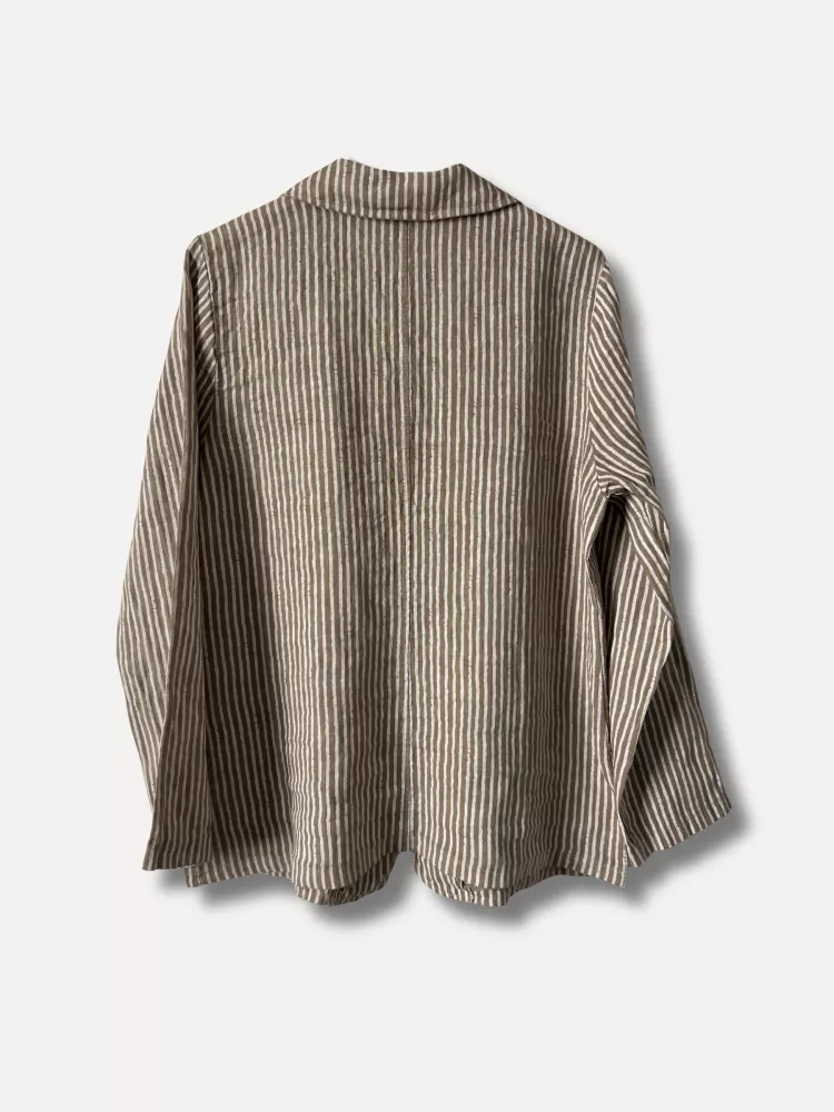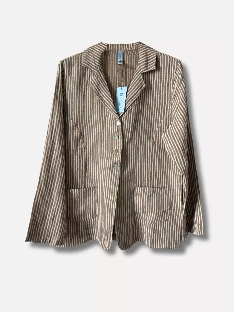 Riktigt snygg kavaj i linne; randig i kamelbrunt och vitt, med slag, lång ärm och fickor fram. Knäppes med 4 skimrande knappar i pärlemor. Dressa upp med skjorta och en snygg byxa - eller bär den lite avslappnat över klänningen.