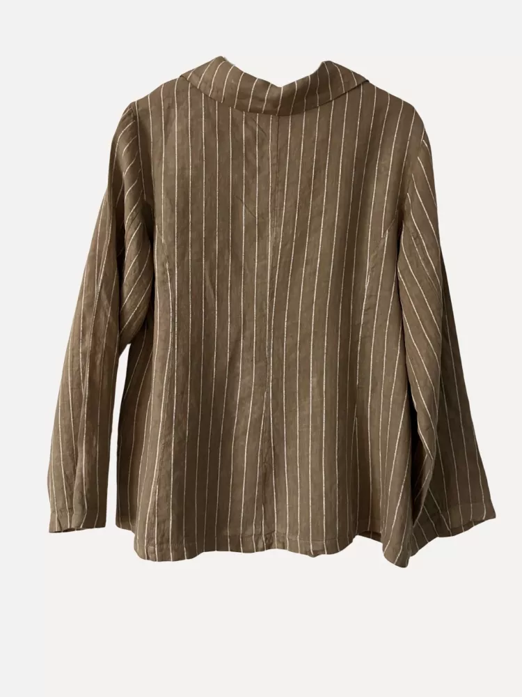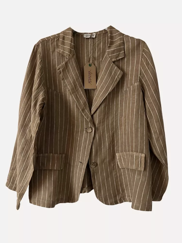 Randig kavaj i linne i en skön jordnära kamelfärgad brun ton, med ljusa smala ränder. Klassisk krage, lång ärm och 2 knappar fram. 2 fejkfickor med lock. Kavajen är ofodrad.