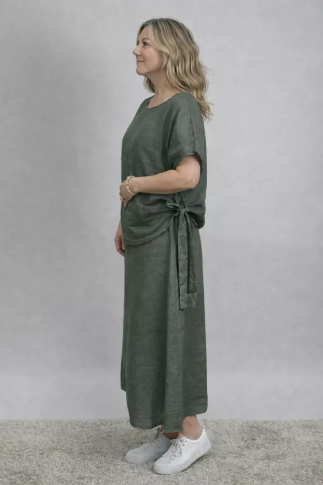 Tillverkad i 100% linne – ett naturligt material som andas och känns svalt mot huden. Linne är slitstarkt, luftigt och får en mjukare känsla med tiden, vilket gör kjolen skön att bära även under varmare dagar.