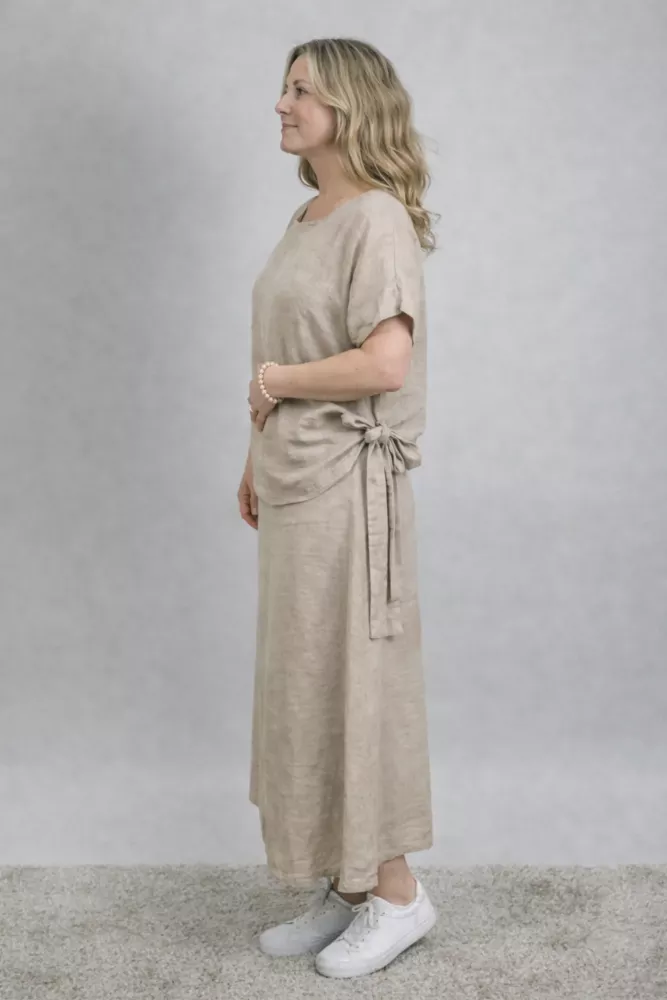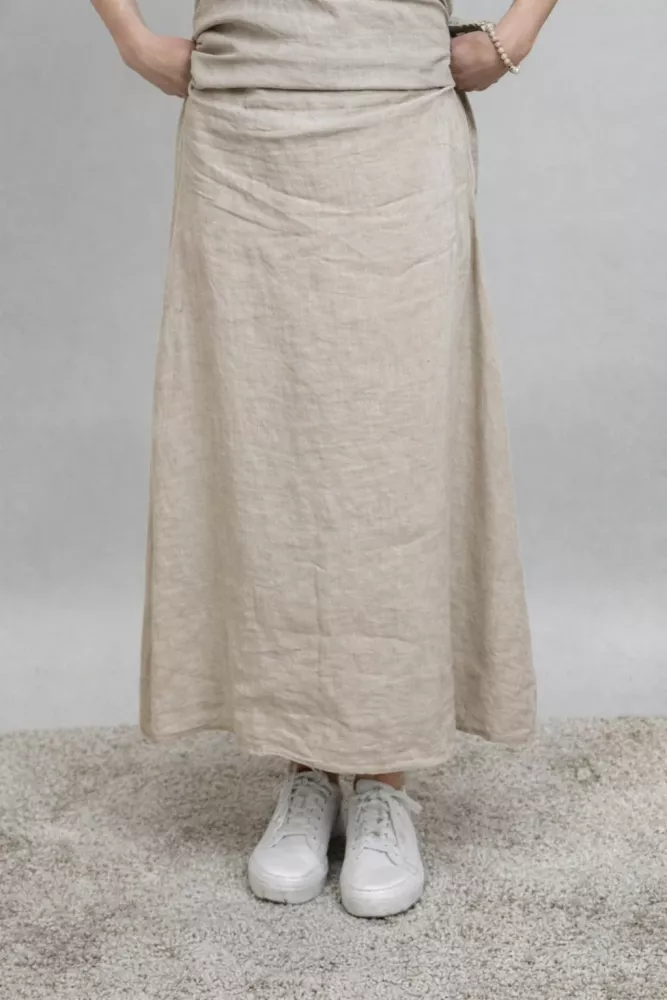 Tillverkad i 100% linne – ett naturligt material som andas och känns svalt mot huden. Linne är slitstarkt, luftigt och får en mjukare känsla med tiden, vilket gör kjolen skön att bära även under varmare dagar.