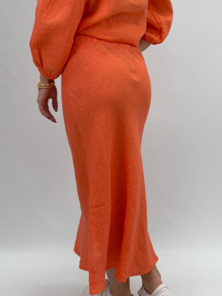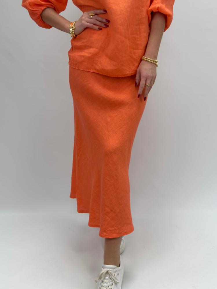 En mjuk och följsam linnekjol i trendigt orange, med bekväm resår i midjan. Lätt utställd siluett ger ett fint fall och en elegant avslappnad känsla