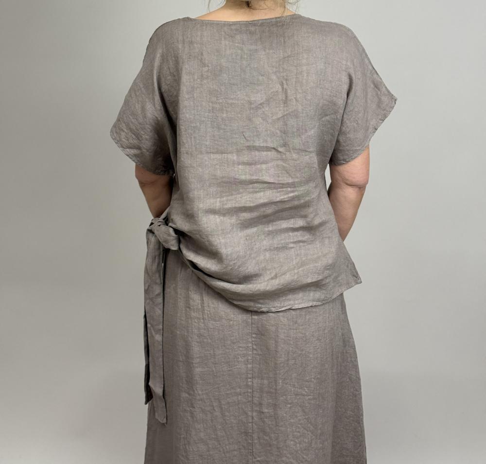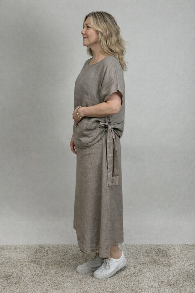 Tillverkad i 100% linne – ett naturligt material som andas och känns svalt mot huden. Linne är slitstarkt, luftigt och får en mjukare känsla med tiden, vilket gör kjolen skön att bära även under varmare dagar.