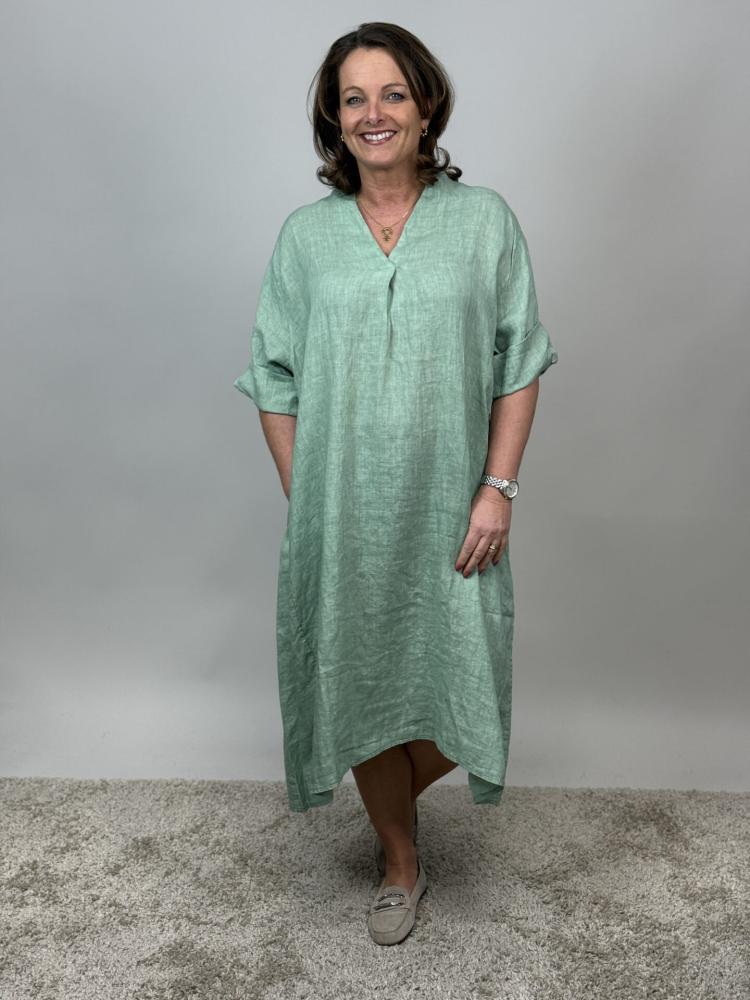 Härligt grön v-halsad linneklänning med sytt veck under v-halsen som ger lite rymd åt bysten. Fickor i sidan och lite härligt rymlig i modellen.