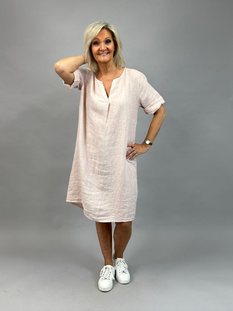 Ljust rosa linneklänning i en rak modell, lite längre bak.