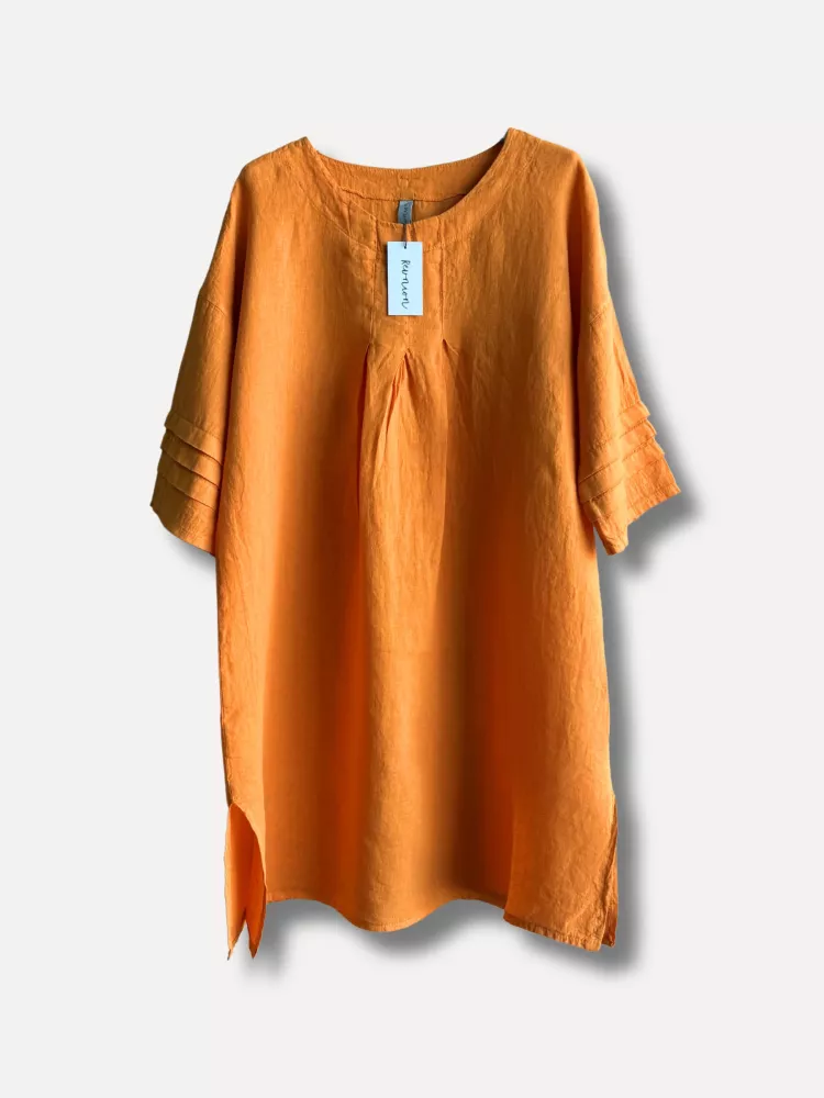 Rundhalsad linneklänning med sydda veck under bysten, vilket ger lite extra utrymme för den som behöver det kring byst/mage. 3/4 ärm som avslutad med sydda veck samt slits nertill i sidorna.