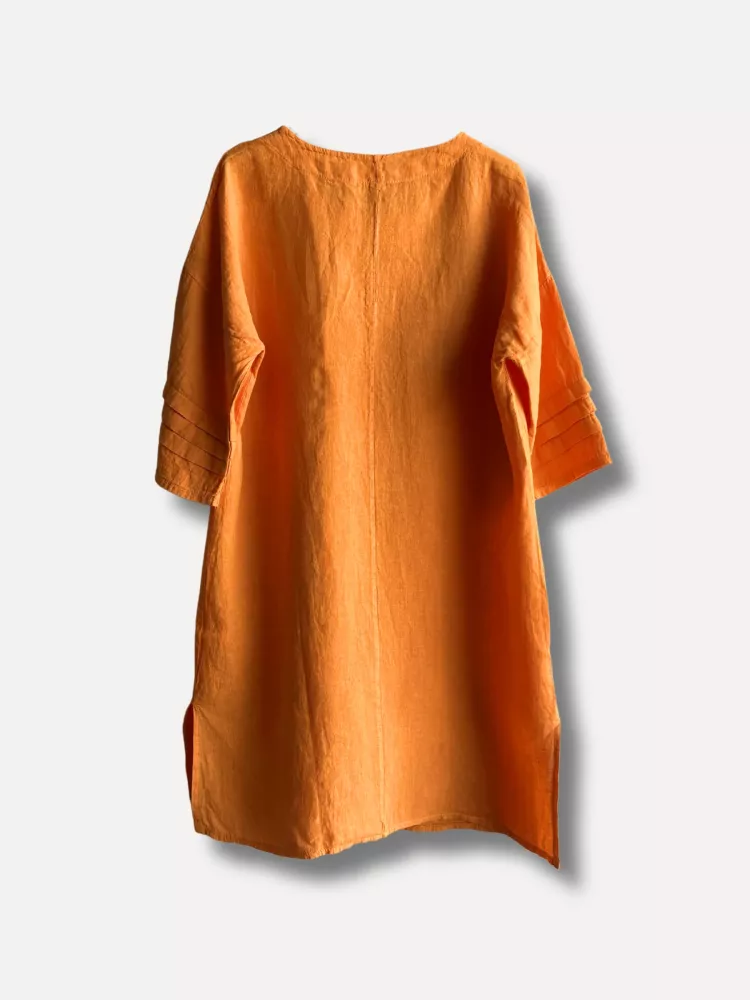 Ljuvlig orange klänning i linne, med rejäl vidd