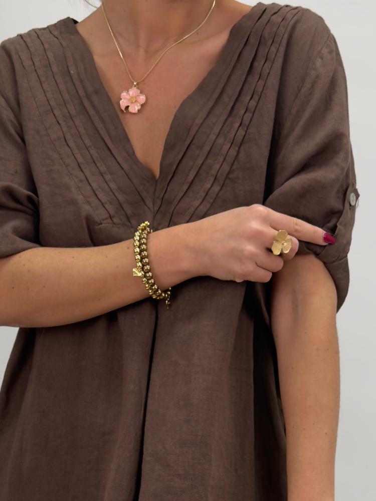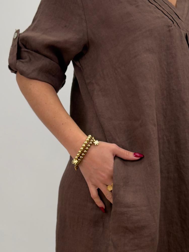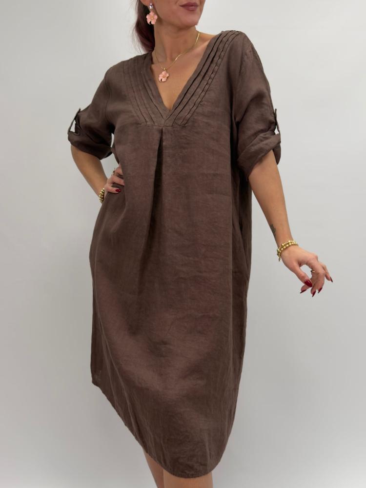 Mångsidig linneklänning med rejäl vidd, i trendigt brunt. Sydda dekorativa veck i v-halsen och knappslå på ärmen - vilket gör det möjligt att ha ärmen antingen uppvikt eller fäst med knapp. Fickor i sidan är ett stort plus!