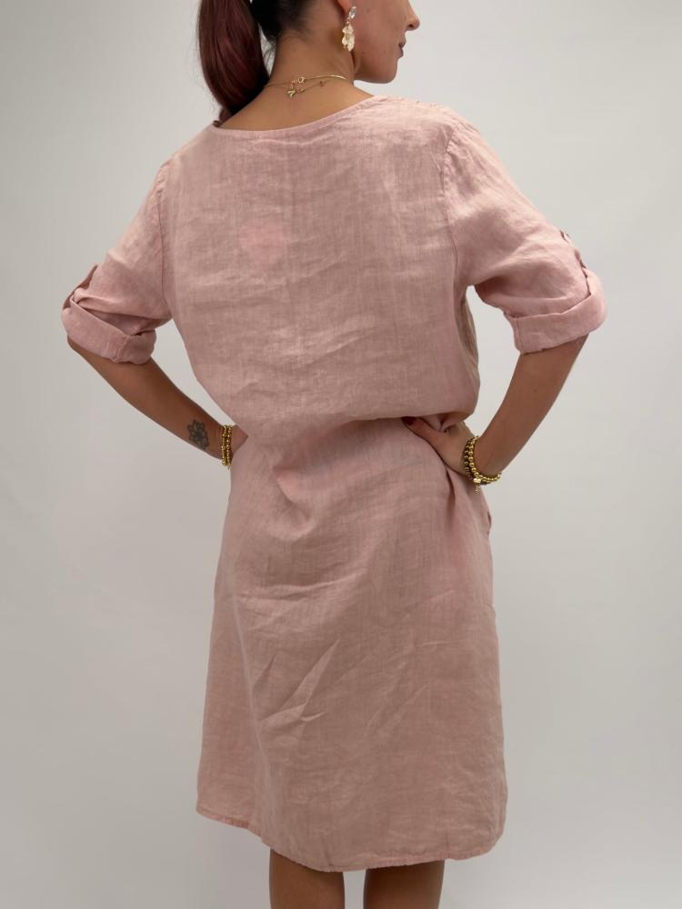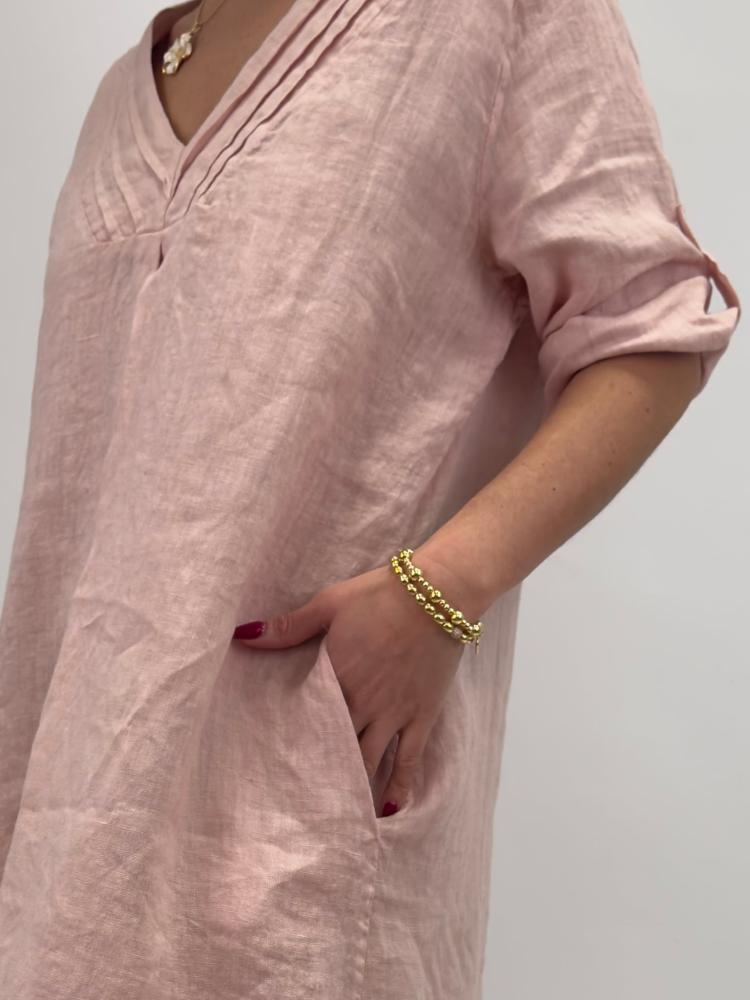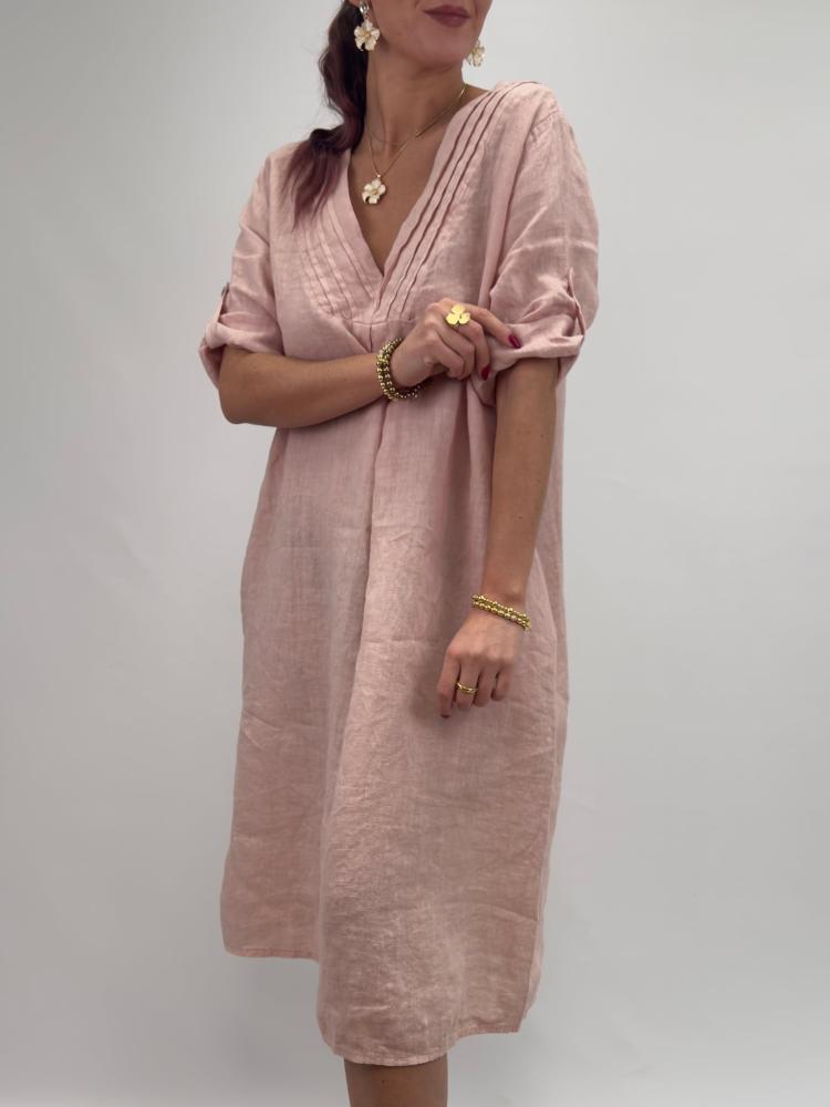 Mångsidig linneklänning med rejäl vidd, i mjukaste puderrosa. Sydda dekorativa veck i v-halsen och knappslå på ärmen - vilket gör det möjligt att ha ärmen antingen uppvikt eller fäst med knapp. Fickor i sidan är ett stort plus!