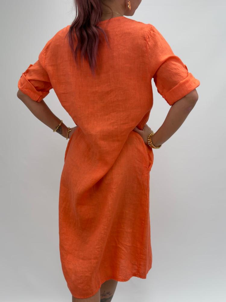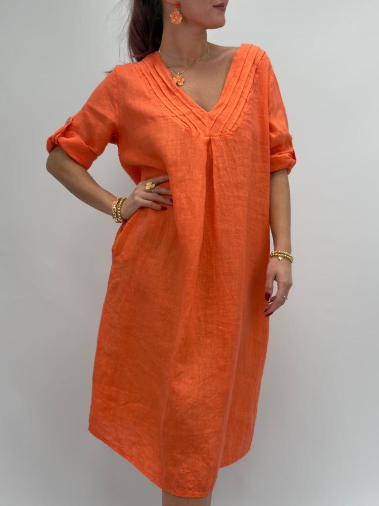Mångsidig linneklänning med rejäl vidd, i trendigt orange. Sydda dekorativa veck i v-halsen och knappslå på ärmen - vilket gör det möjligt att ha ärmen antingen uppvikt eller fäst med knapp. Fickor i sidan är ett stort plus!